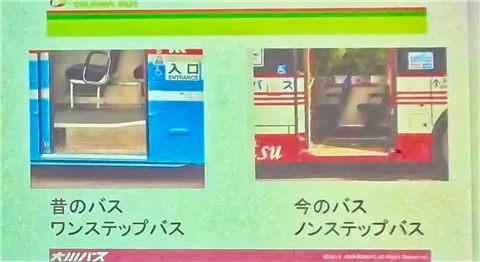 あとノンステップバスというものの説明ですね。昔のタイプって、地面から一段上がって、さらにもう一段上がるようになってたと思うんですけど、今のバス。その段差が一段ちょっと減っているというところで、今日止めてあったバス。すでに見られた方も何名かいらっしゃったんですけれども、段差が減ってちょっと乗りやすくなってますよ、というのが今のバスです。