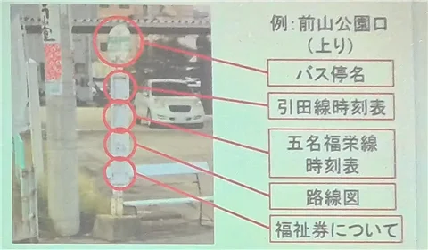 バス停の名前があって、下に引田線の時刻表と、あとここ三本松から東の方ですね引田の方に向かっては一部五名福栄線ですね。路線が被っているところもございますので、その時刻表、あと路線図と先ほどありました福祉バスについての説明ですね。主にこのような情報が入っております。