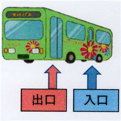 まず、今からこの後ですね、外に出て、実際に路線バスにご乗車いただくんですけども、バスの乗り方を簡単に説明させていただきます。バスは、バスにはですね、ドアが二つほどついております。