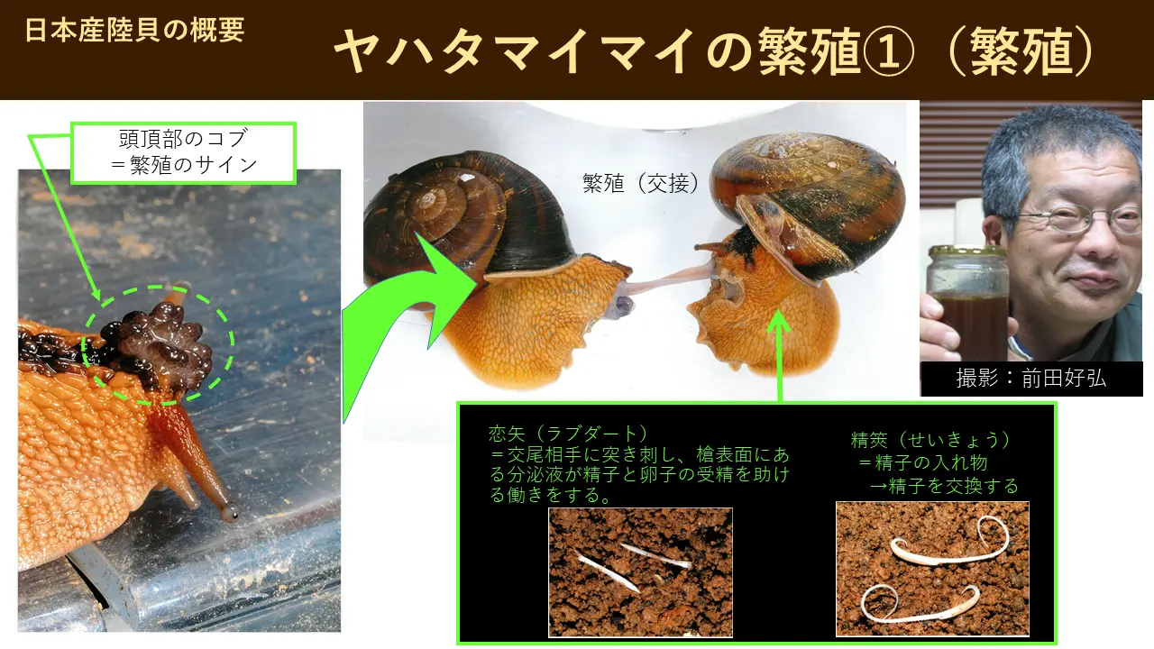 これ、前田さん言って、小豆島の人ですけれども、その指定種の前の時代から、カタツムリの研究をしておりまして、こういう繁殖期になりますと、この頭の先にこぶ作るんです。これまあ、繁殖のサイン、私、OKですよというやつですね。で、この二匹が一緒にこう交尾するんです。このクイズにもありますけどね、あのカタトムリは雄と雌とね、体の中に両方持ってるんです。だから、男である女である。だけど、必ず、子孫を作るときは、二匹が一緒に。一匹ではいかん。そういうね、面白い。これは面白い部分に入ります。