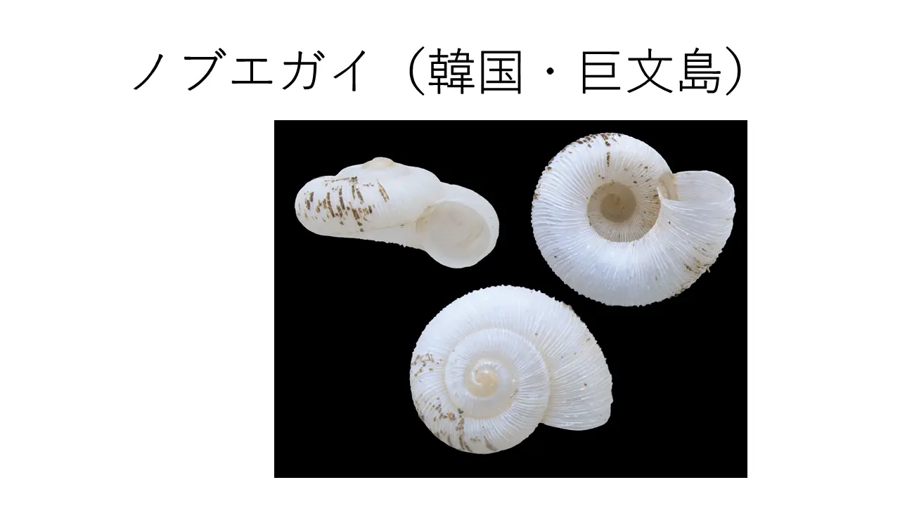 これ、ノブエガイと言いまして、韓国で最初に見つかりました巨文島というところでね。これ実は、最近、黒田言うて、若い京都大学に行ってる、愛媛県出身の黒田君がですね、巨文島まで行って、採ってきました。