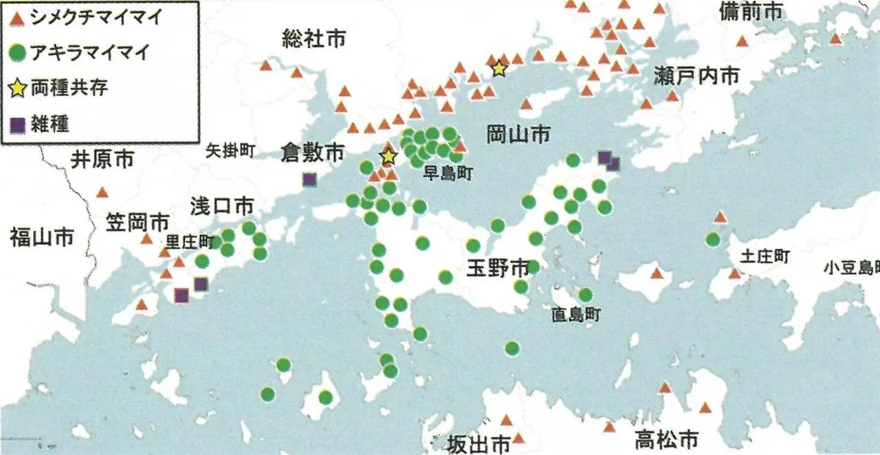 そしてその岡山の人は一生懸命、岡山の付近を駆け巡って、そしてこの三角印。▲印がシメクチマイマイです。で、●がアキラマイマイです。どうもこの辺りで境目があるのが分かりますね。