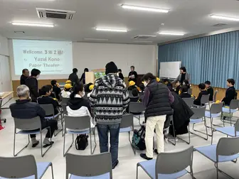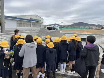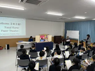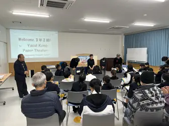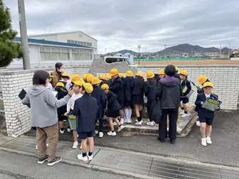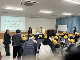 当日は、三本松地区活性化協議会 街づくり部会「ふるさと探訪の会」の皆さんが制作した保井コノの紙芝居の上演や、背後に展示した関連資料をご覧いただき、あわせて銅像も見学されました。児童の皆さんからはたくさんの質問が出るなど、終始にぎやかで、子どもたちの熱心な姿に、協議会の皆さん、老人会の皆さんも元気をもらいました。」