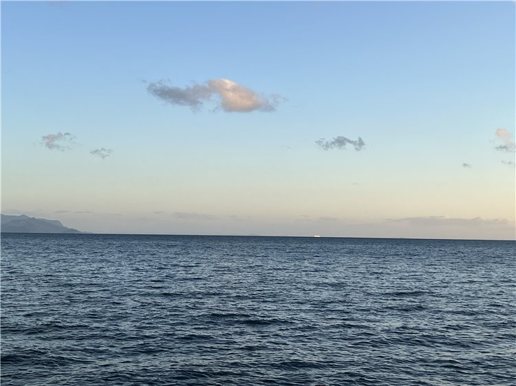 気温21℃、西の風が吹き流し角度45°で吹いています。空は晴れ、雲があちこちに浮かんでいます。細くなった下弦の月がその雲に見え隠れしています。輝く太陽が与治山の南のスロープの高い所に出て来ました。釣り客は赤灯台に5人、この波止は先ほどまで3人、港に1人です。阪九フェリーのいずみ号が朝の光を受けて白く輝いています。