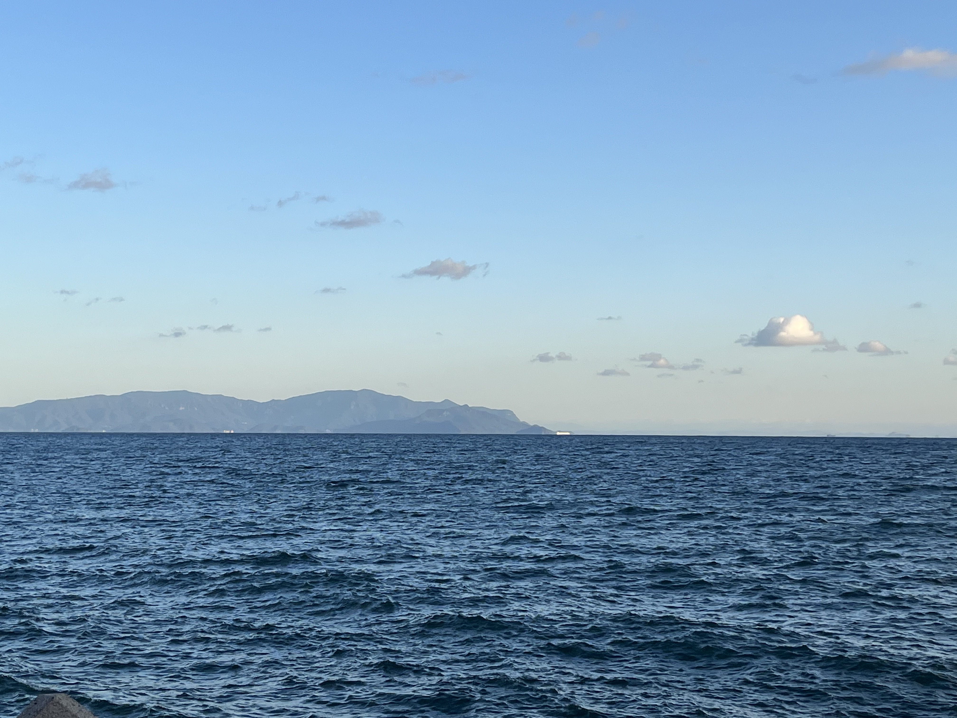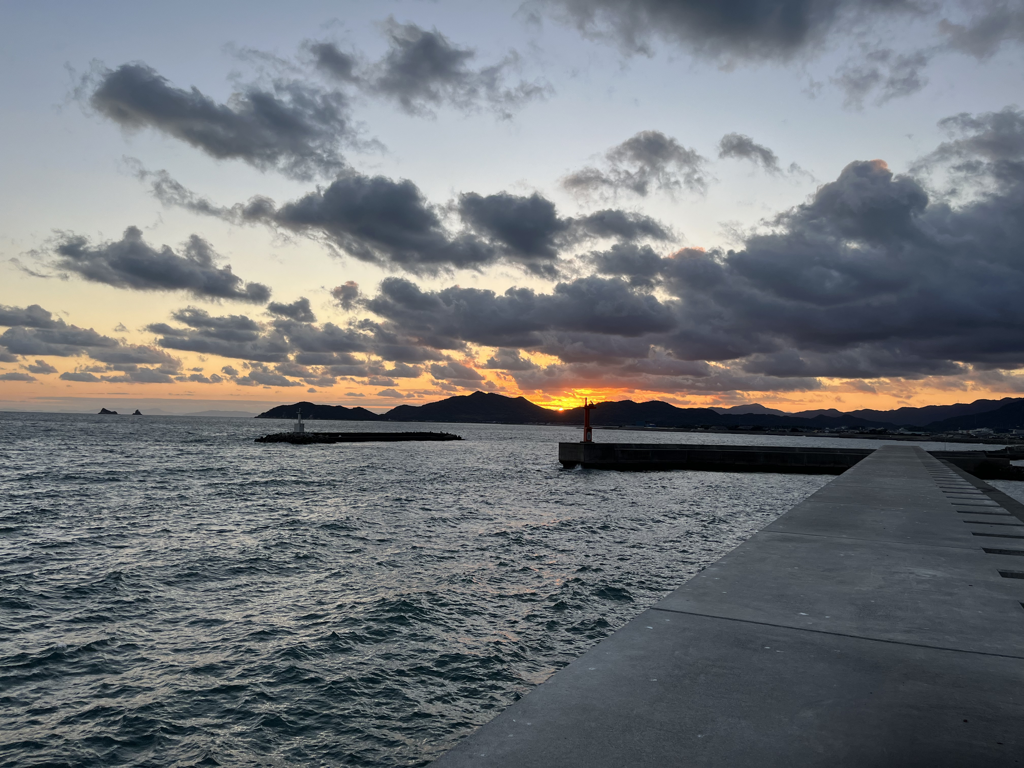 気温15℃、北東の風が引き流し角度70°くらいで吹いています。空は晴れ、雲があちこちに浮かんでいます。与治山と伊座山の大きな半円形の谷間に見える幾筋もの雲が紅く輝き、谷間の一番低い所から太陽が姿を見せました。釣り客は赤灯台に1人、この波止に2人、港に1人です。小豆島の南の航路を大型貨物船Verde Heraldo号(船長299m、幅50m、FindShipから)が西に向かっていました。