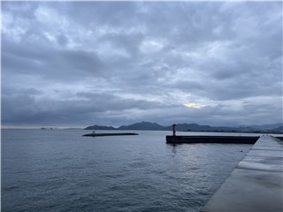 気温23℃、風はほとんどありません。雲が空一面を覆い、虎丸山も上半分が雲の中です。日の出の気配も僅かで、かろうじて北の地平線が紅くなり、六甲山が見えています。太陽は姿を見せませんでした。釣り客は東波止に1人、赤灯台に3人、この波止に先ほどまで4~5人、テトラに2人、港に2人です。この波止の釣果はまずまず。シラサギの群れが沖合いを西に向かっています。小豆島の南の航路にはフェリーROKKO(六甲)が東に向かっています。