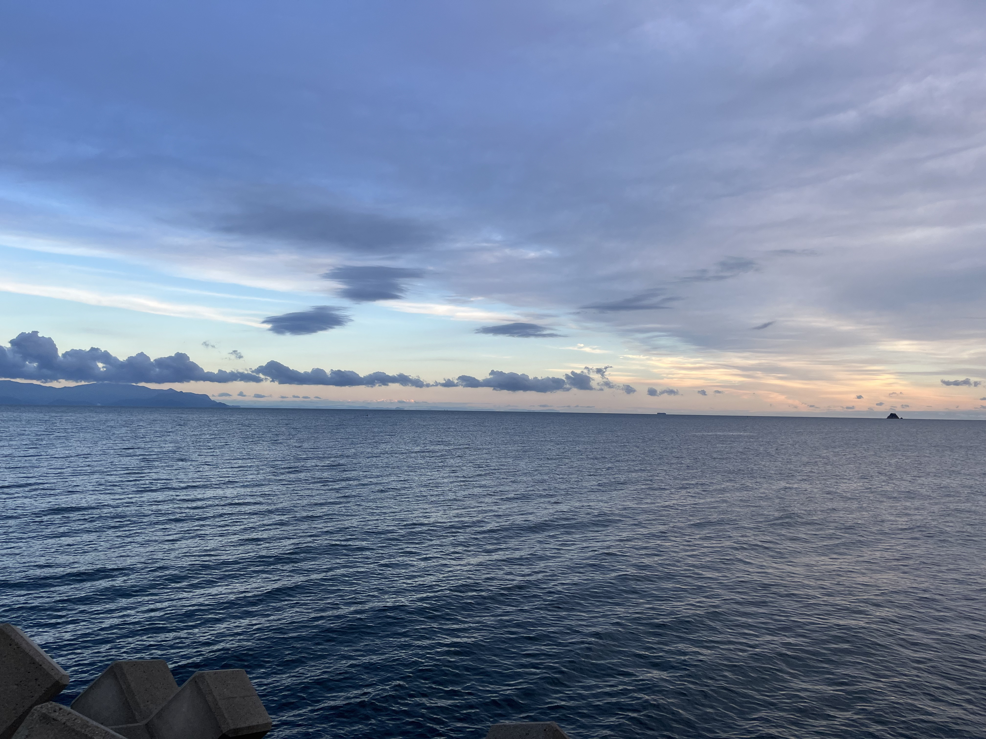 気温13℃、昨日の雨は上がり、朝早くから釣り客で賑わっています。東波止に2人、赤灯台に6人、この波止に3人、港に1人、大物狙いのルアー釣り客が多そうです。空全体に薄く雲が残り、しばらく前に真っ赤の朝焼けだった東の空にも太陽は姿を見せませんでした。鳩の群れが一斉に飛び立ち、港の上空を旋回してくれました。