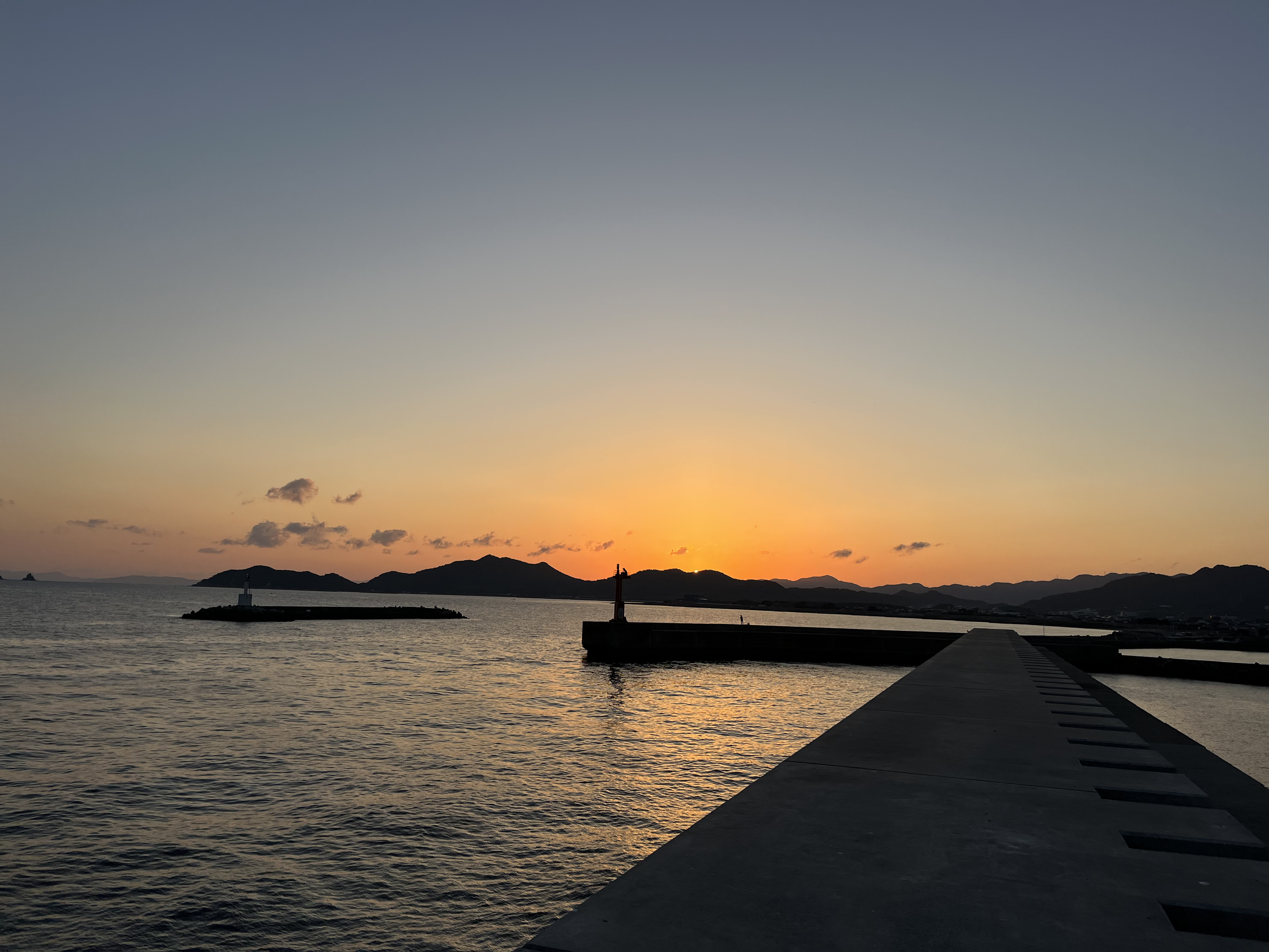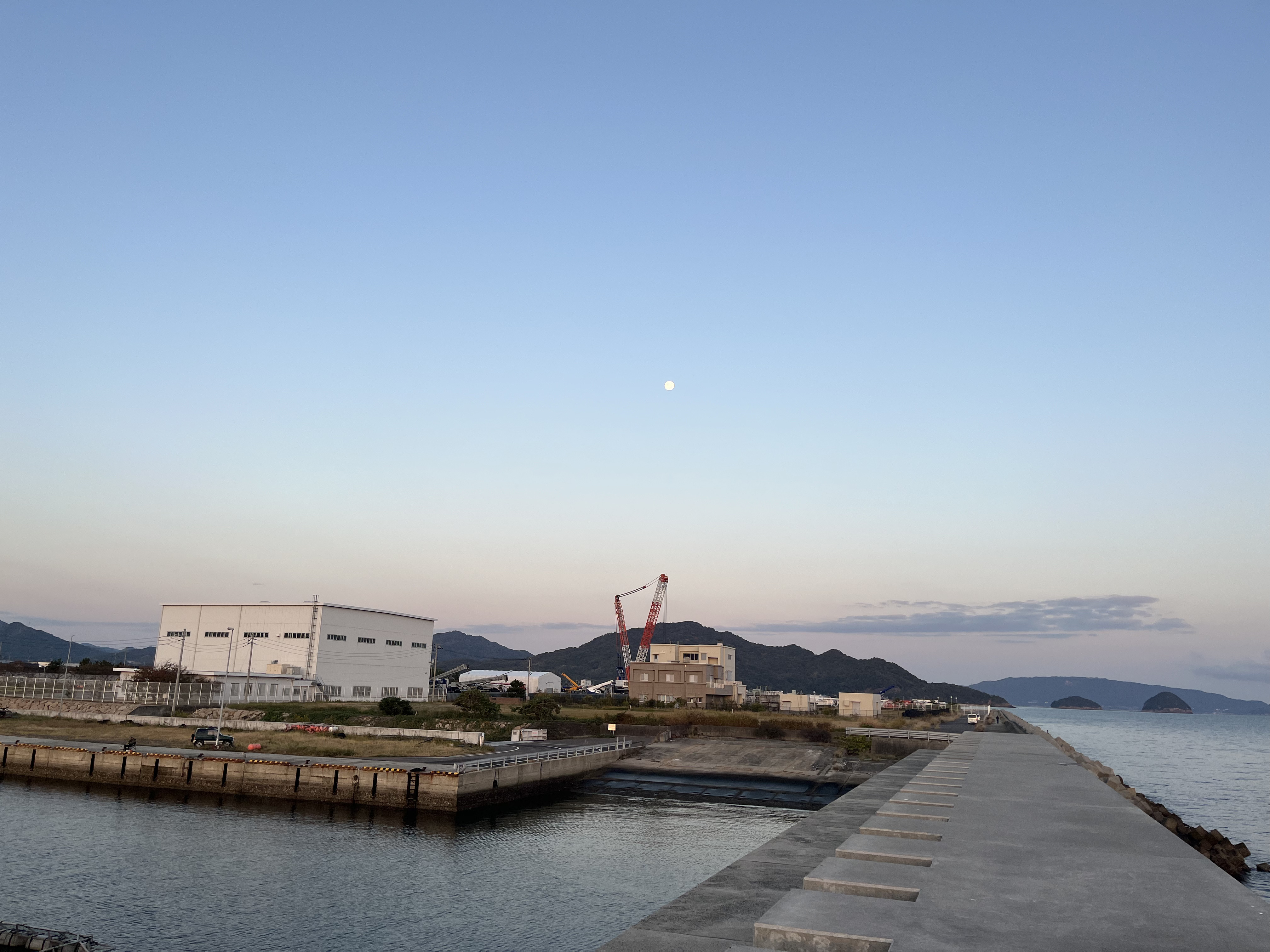 気温11℃、快晴、雲はほとんどなく、北西の風が吹き流し角度50°で軽く吹いて、心地よい朝です。西の空には満月、今年最大のスーパームーンの残月が少しずつ高度を下げています。確かに大きいです。太陽が6時36分42秒、伊座山塊の南の峰に出て来ました。釣り客は赤灯台に3人、テトラに2人、港に1人です。小豆島の南の航路を船の後ろ半分が紅いパンスターミラクル号(釜山⇌大阪)が東に向かっています。
