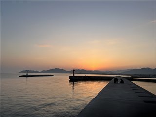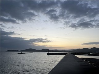 気温14℃、北西の風が軽く吹いています。空には雲が拡がり、東の空の山の端が紅く染まっています。太陽が伊座山上の雲の合間からぼんやり姿を見せました。釣り客は東波止に2人、赤灯台に16人、この波止に2人、テトラに5人、港に3人です。ヨットが1艘寄港してくれています。