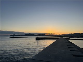 気温8℃、西の風が吹いて少し冷え込んでいます。空は快晴、雲は東の山上だけです。飛行機が未明の橙色の空に短いジェット雲を残しながら東に向かっています。阿讃山脈の上空にも2機が関空に向かっています。釣り客は東波止2人、赤灯台5人、この波止1人、テトラに5人です。港にはヨットが1艘停泊しています。6時49分27秒、太陽が大麻山山塊の山の端に出て来ました。