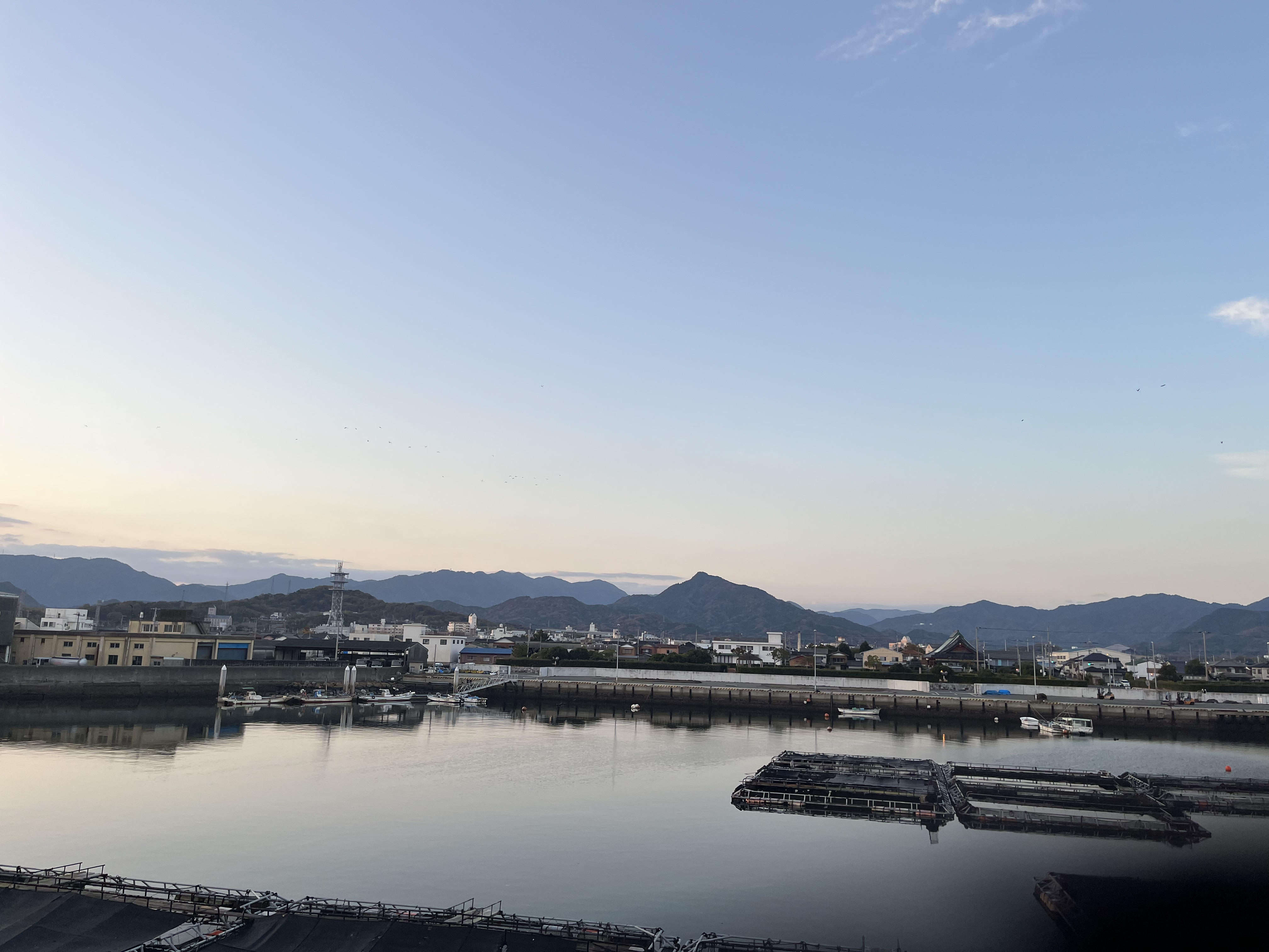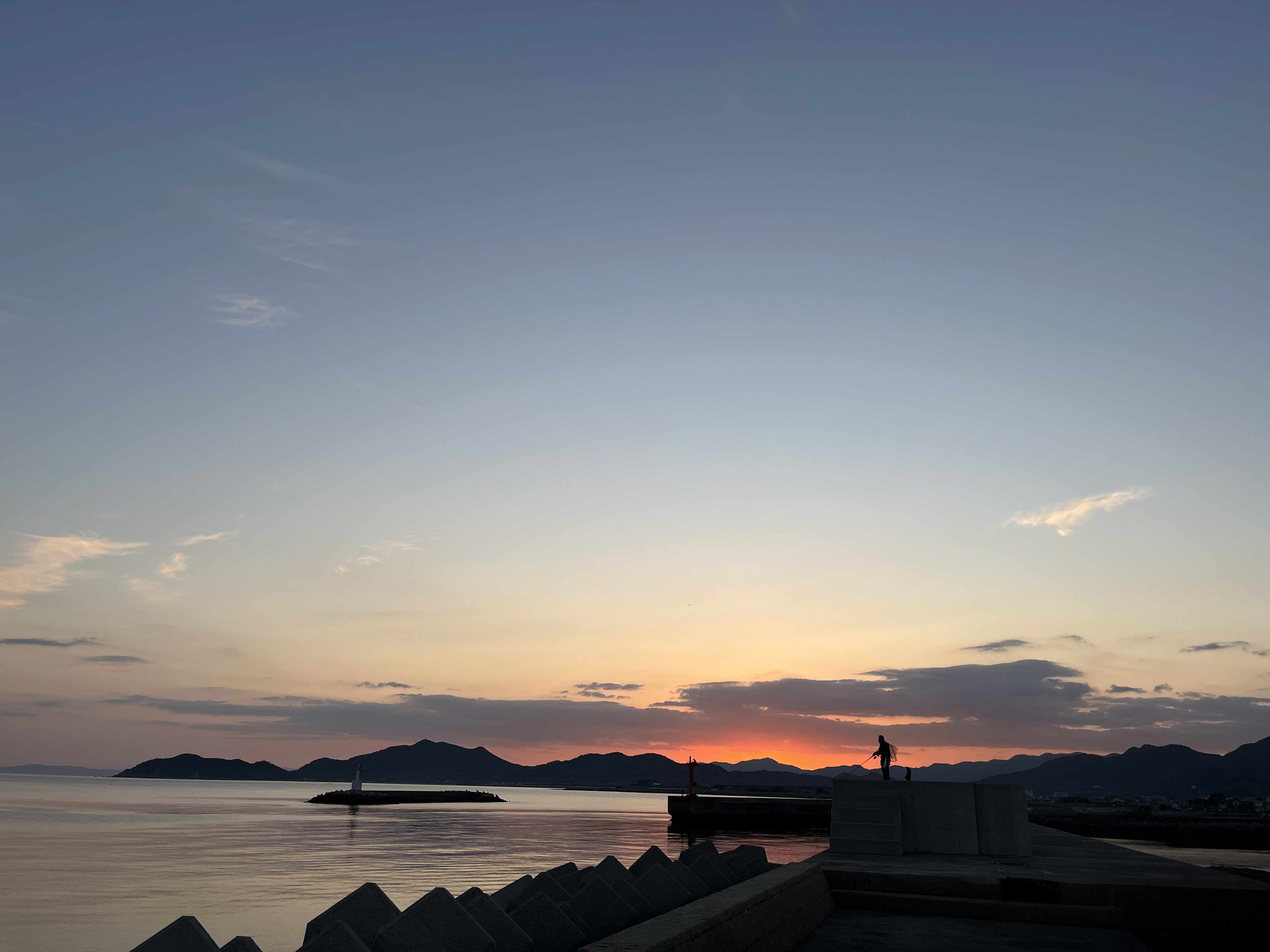 気温11℃、晴れ、風はほとんどなく海も穏やかです。西の空には細くなった十七日の月が残っています。東の空は茜色に染まって、阿讃山脈から飛行機が関空か伊丹空港へ向かって高度を下げています。釣り客はこの波止に2人、テトラに2人です。太陽が大麻山の南の斜面に姿を見せました。そのあと直ぐに鳩が一斉に飛び立ちました。