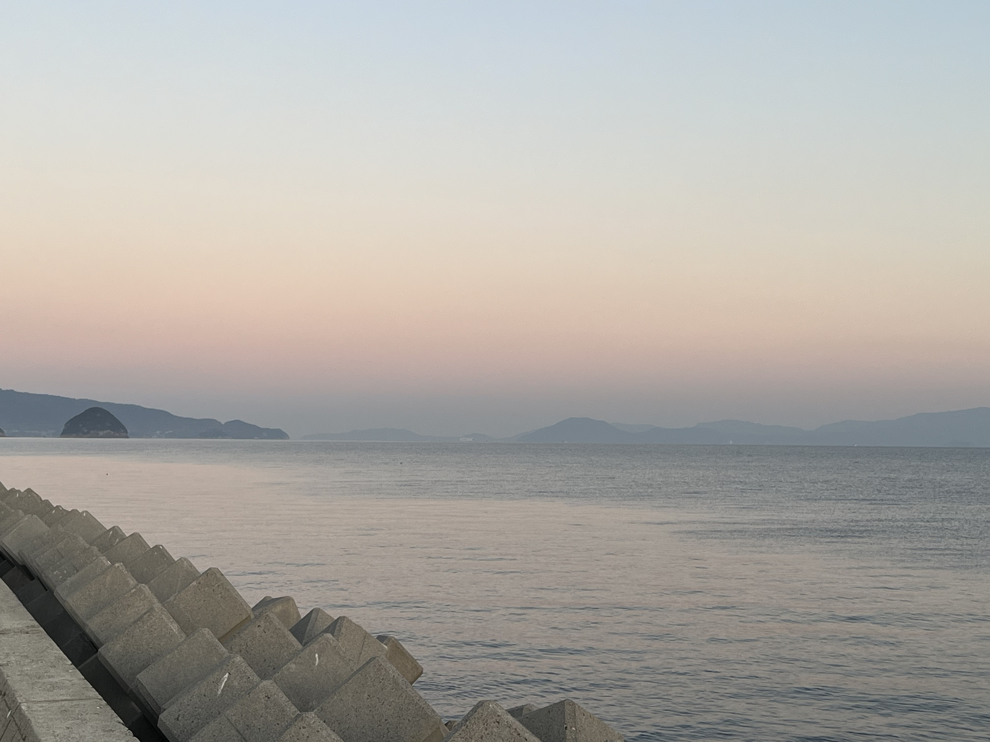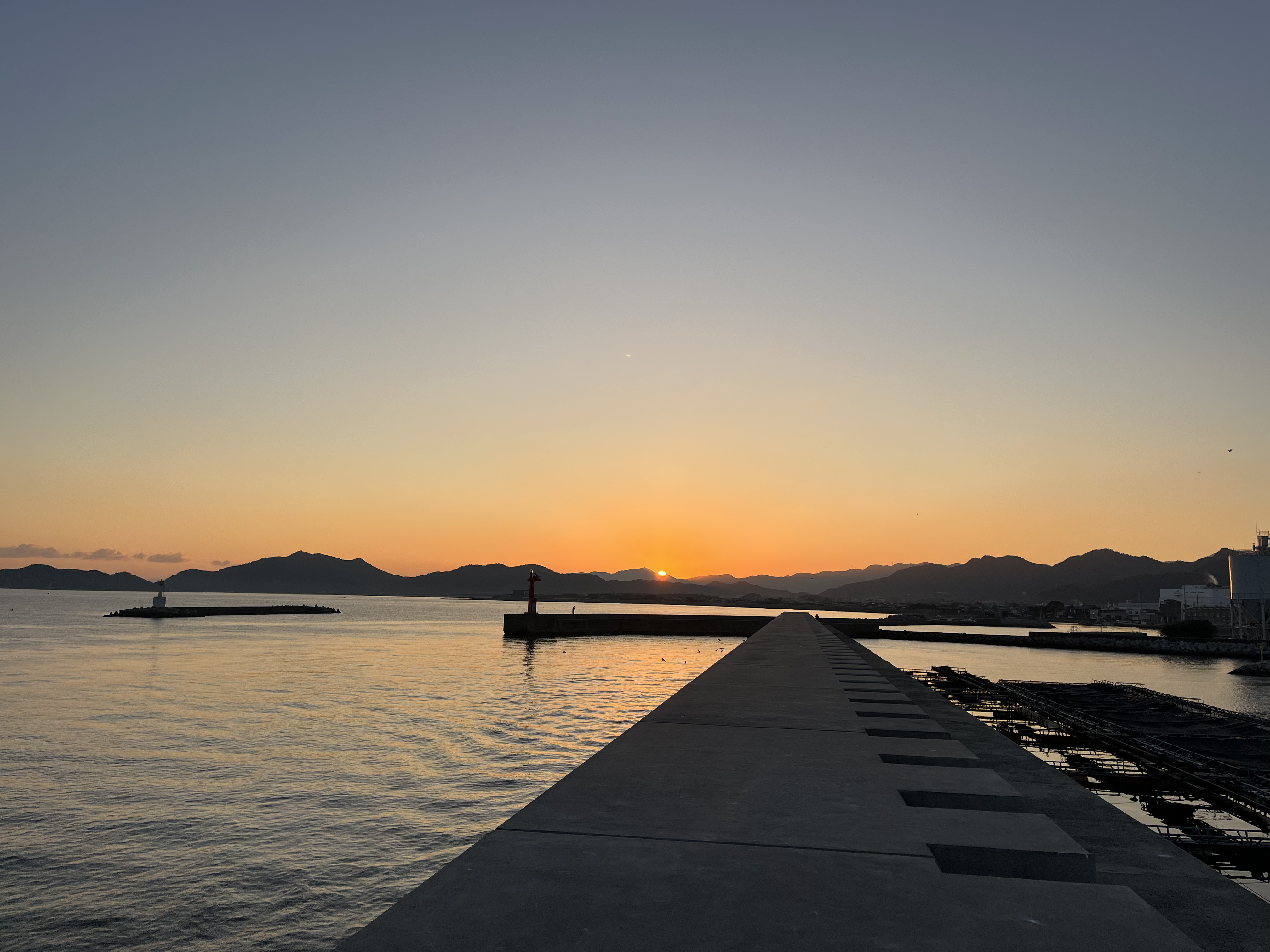 気温6℃、快晴、西の風が吹き流し角度60°くらいで吹いています。西の空はピンク色、東の空は橙色にほんのり染まっています。少し上に細くなった月が残っています。小豆島の南の航路を白亜の大型自動車運搬船Hoegh Seoul号(228m、幅32m)が西に向かっています。海鳥たちが沖合で小魚の群れがいるのか着水を繰り返しています。太陽が大麻山の南の斜面に姿を見せました。釣り客は赤灯台に1人、テトラに1人、港ではフグの輸送トラックが準備をしています。