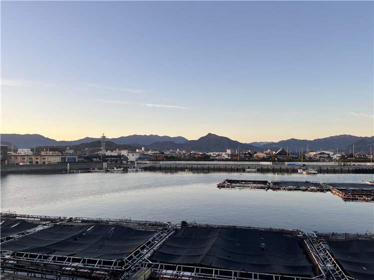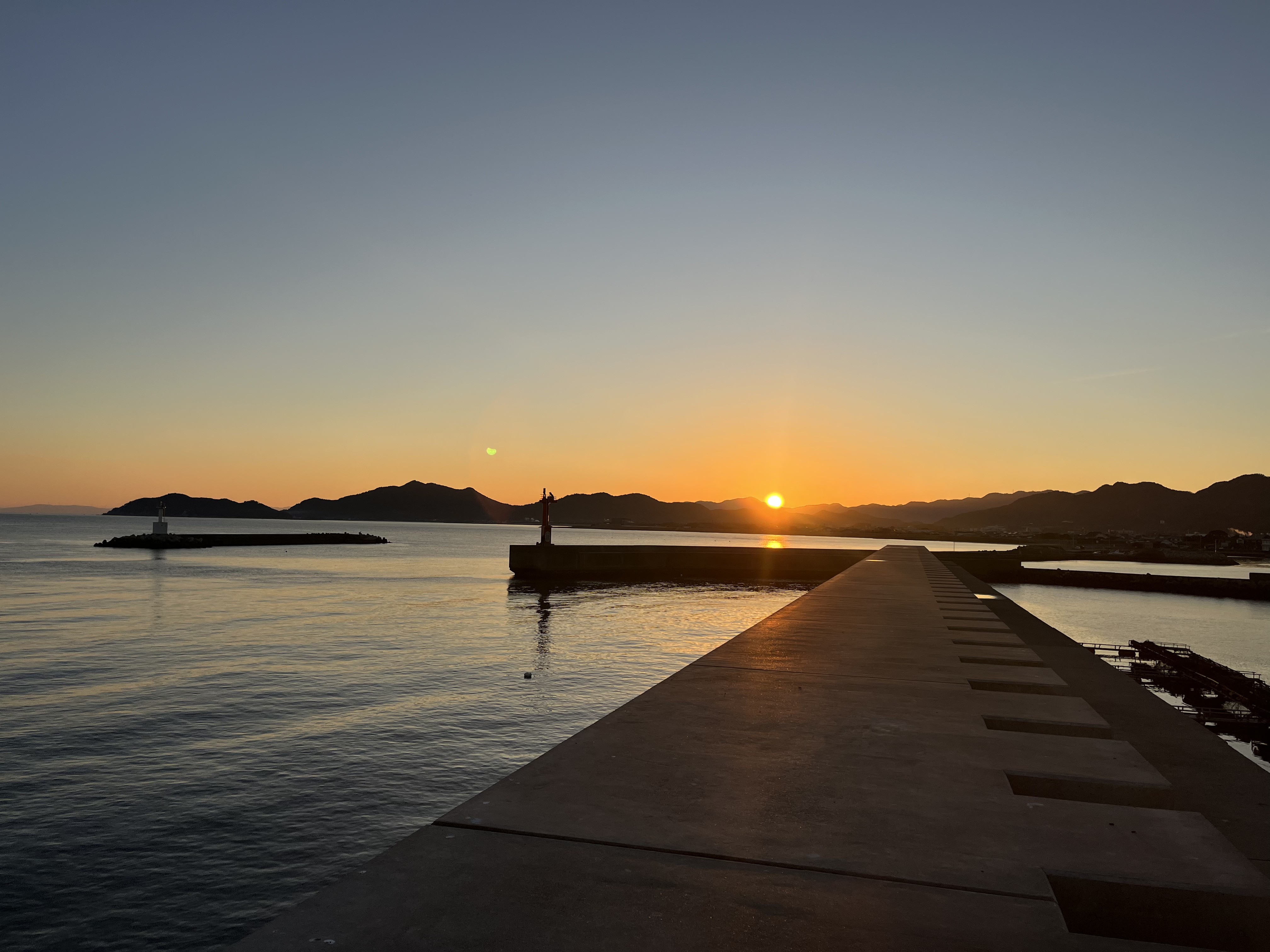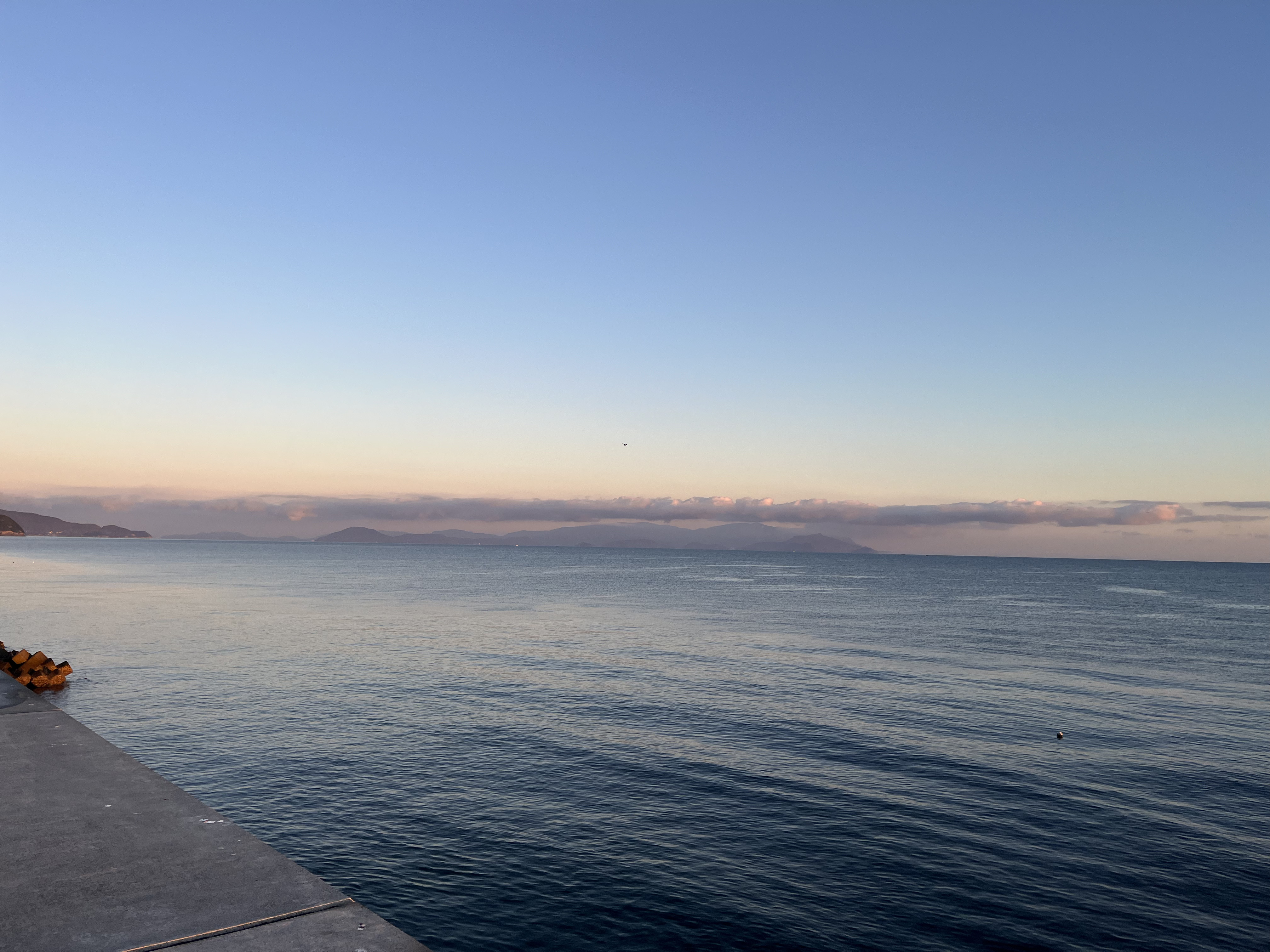 ◀ ▶ 気温5℃、快晴、冷たく感じる朝です。海は鏡面のごとくに穏やか、少し漣が見えるところもあります。東の空はほんのり曙色に染まり、7時12分38秒、太陽が大麻山の一段下がった南の斜面に出て来ました。釣り客は赤灯台に1人、テトラに1~2人です。
