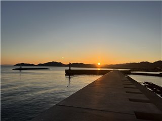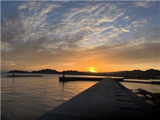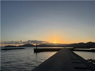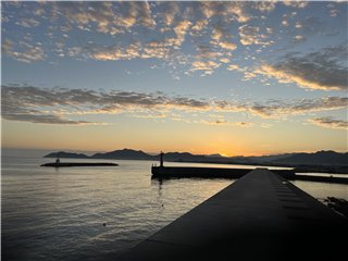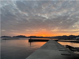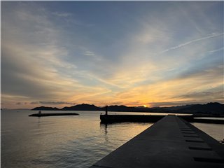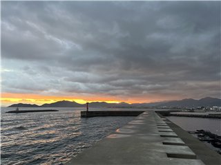 大麻山の向こうはオレンジ色に染まり、太陽が山の端に姿を見せました。釣り客は赤灯台に1人、テトラに2人、この波止の東端にはオカリナさんです。港には2本マストの大型ヨットが停泊しています。暫くして、太陽は雲に隠れてしまいました。