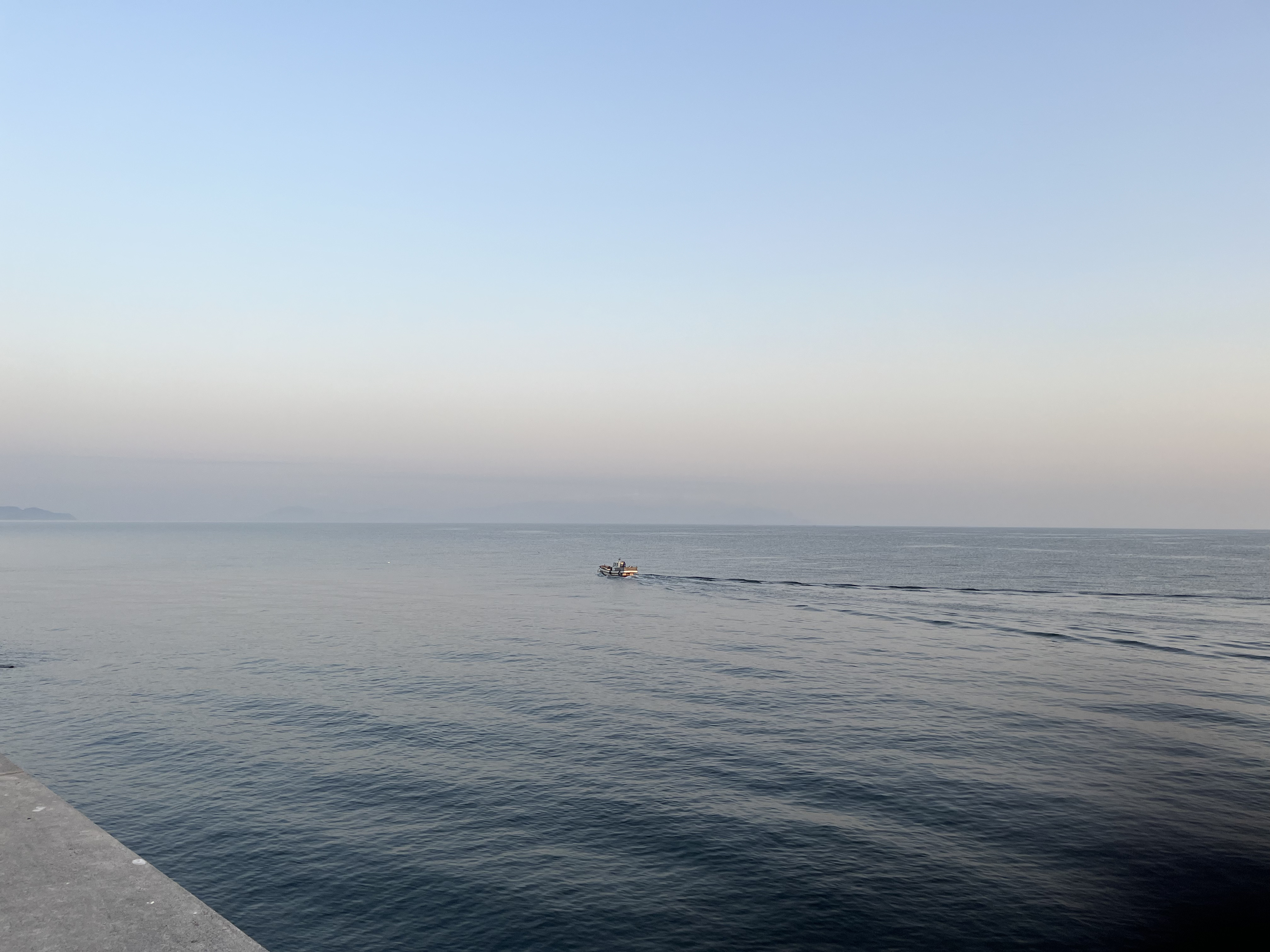 気温6℃、快晴。雲一つりません。水平線から周囲の山々には靄がかかり橙色がグラデーションでひろがり、天空は青空です。風は吹き流し角度30°くらいで穏やかに吹いています。7時16分34秒、太陽が大麻山の山の端に出て来ました。釣り客はゼロ、港ではフグの出荷の準備作業が始まっています。日の出時刻が少しずつ速くなっています。今頃は20秒、これから毎日1~2ずつ早くなり、お彼岸頃は前の日より1分20秒くらい早くなります。