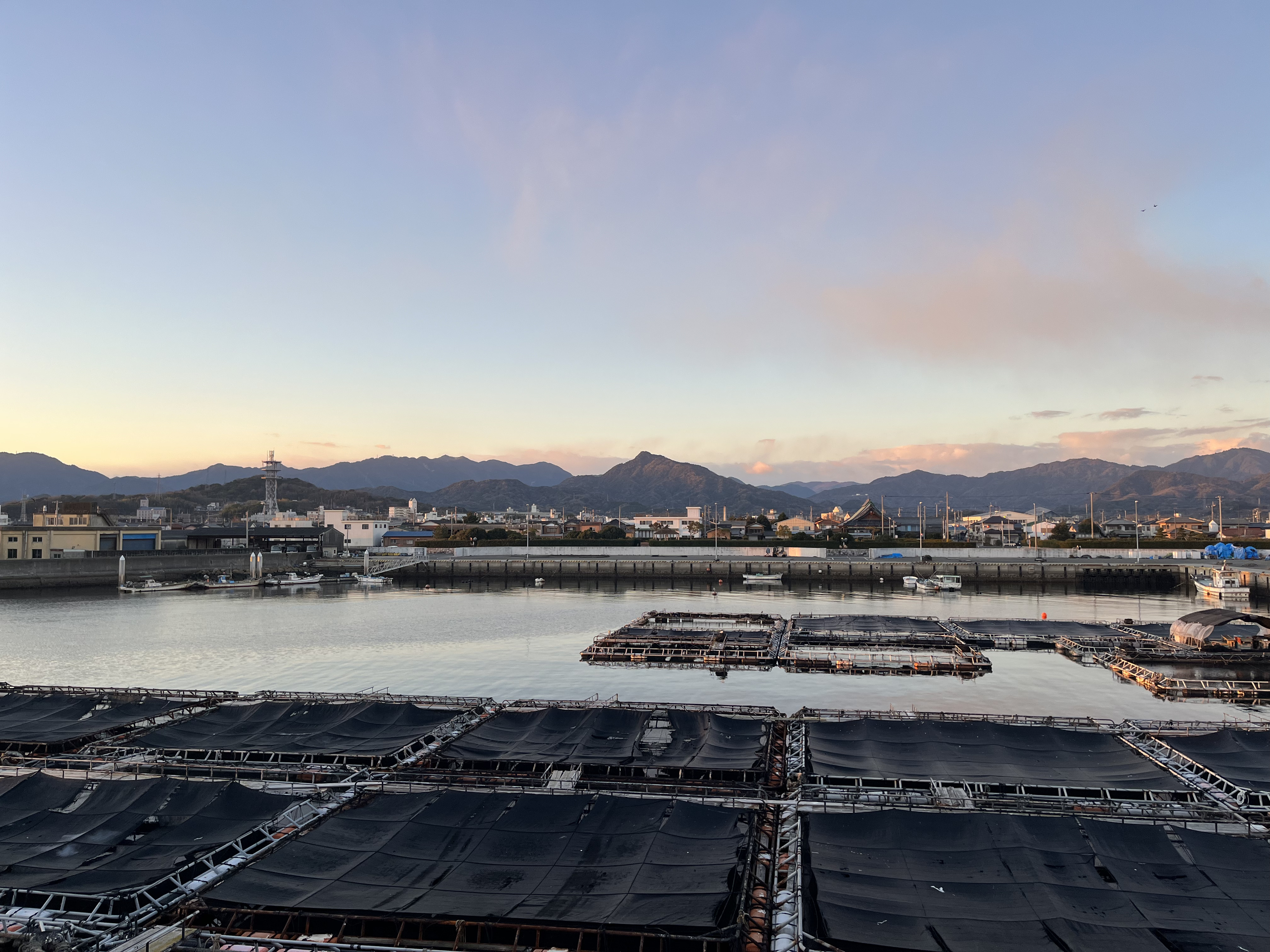 ◀ 気温1℃、快晴、北西の風は緩く吹いています。播磨灘のあちこちに雲が浮かび、淡路島も小豆島も阿讃の峰々、虎丸山もくっきり見えます。東の空の橙色が次第に濃くなり、太陽が姿を見せました。釣り客はゼロ、港の生簀の作業が始まっています。