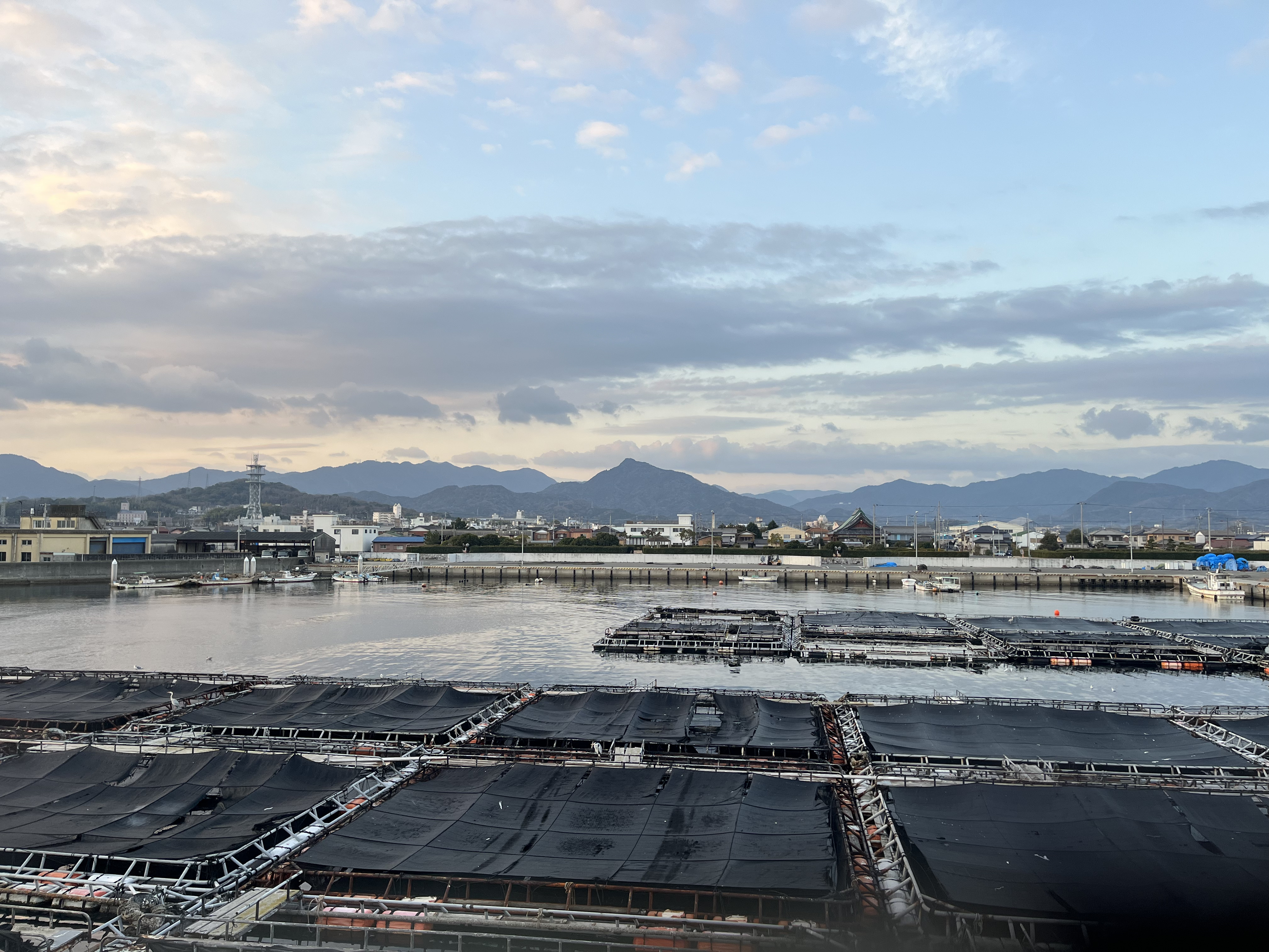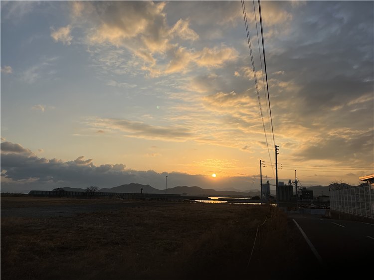 気温3℃、晴れ、風は緩く、海も穏やかです。貨物便のAJT1030機(杭州→アンカレッジ、B767)の白い飛行機雲が淡路島上空を東に向かっています。伊座山から大麻山上空の雲が紅く染まっています。釣り客はゼロ、港ではフグの生簀の作業が始まっています。帰る途中で太陽が雲の上に姿を見せました。
