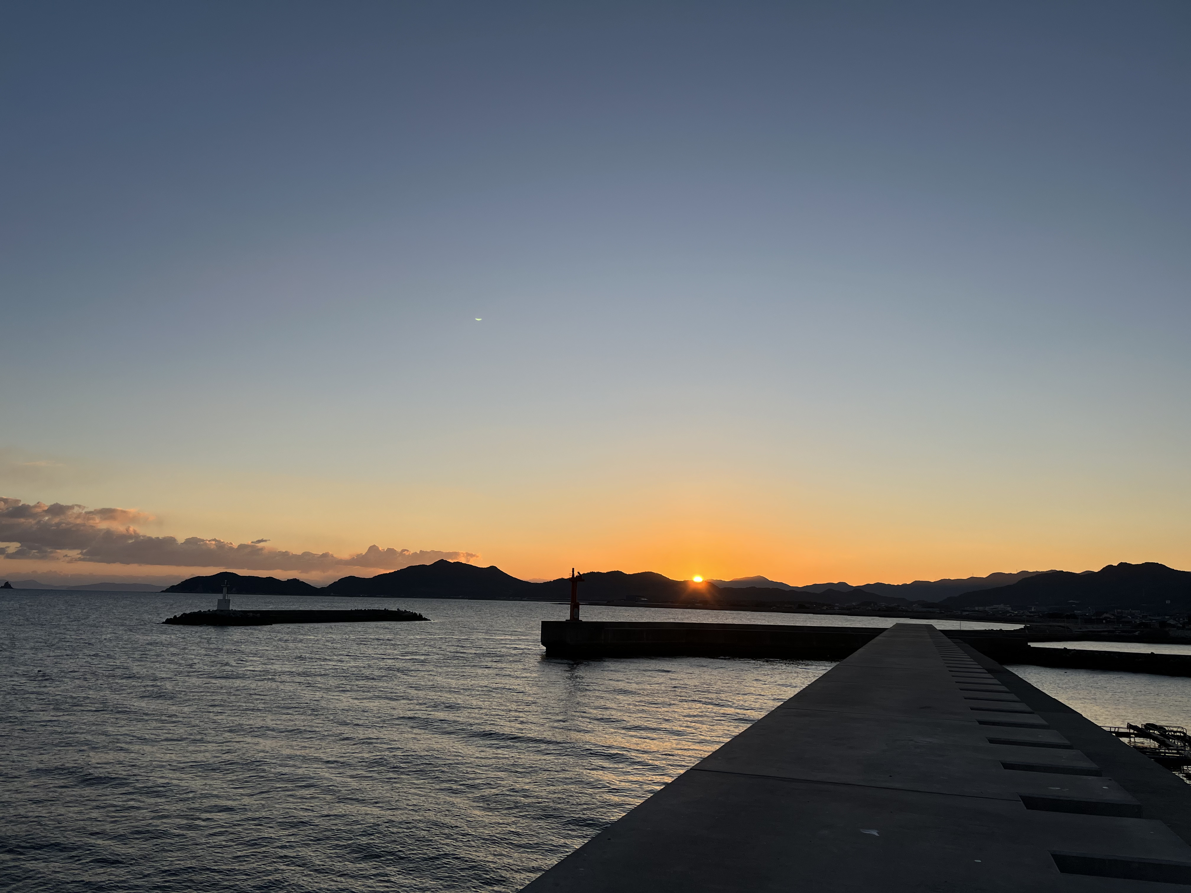 気温1℃、快晴、北西の風は緩く吹いています。播磨灘のあちこちに雲が浮かび、淡路島も小豆島も阿讃の峰々、虎丸山もくっきり見えます。東の空の橙色が次第に濃くなり、太陽が姿を見せました。釣り客はゼロ、港の生簀の作業が始まっています。