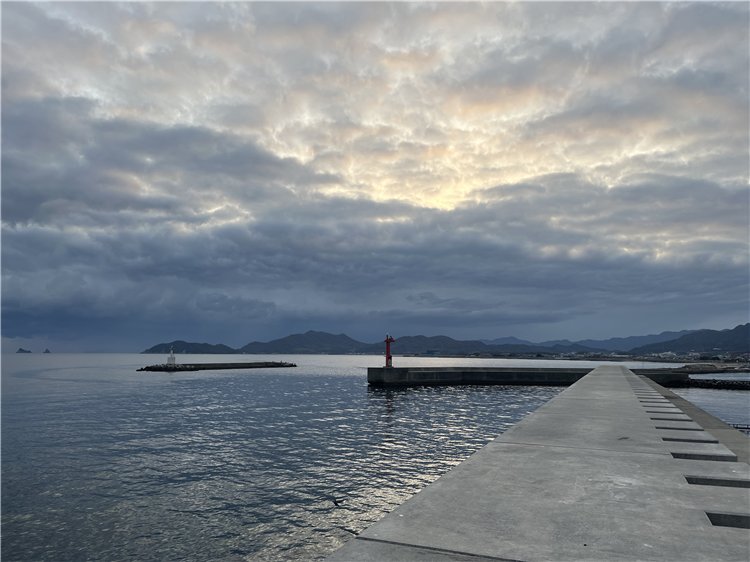 気温2℃、曇り、風はほとんどなく、吹き流しもだらり状態です。東の空は厚い雲があって暗く、その雲の高く上部が明るくなって日の出の気配です。釣り客はテトラに1人、港では生簀の作業が始まっています。