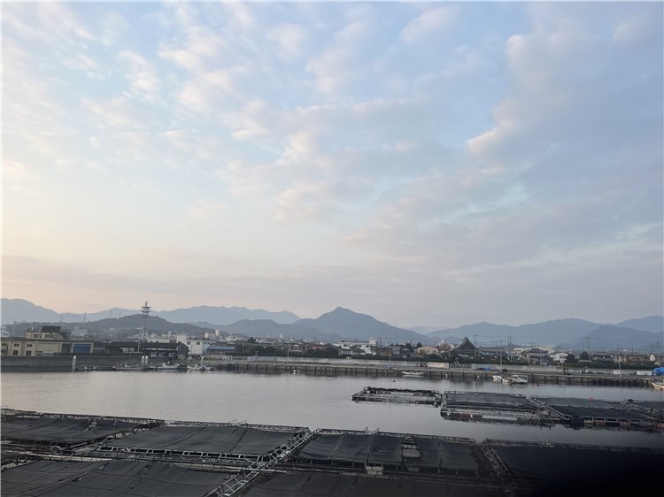 気温5℃、曇り、西の風が緩く吹いています。海には霧か霞が懸り、淡路島も小豆島も見えません。伊座山塊の上の雲の端が細く金色になっています。青空も所々に見えています。暫くして、紅い太陽が雲の上に姿を見せました。釣り客はテトラに1人、港では生簀作業が始まっています。