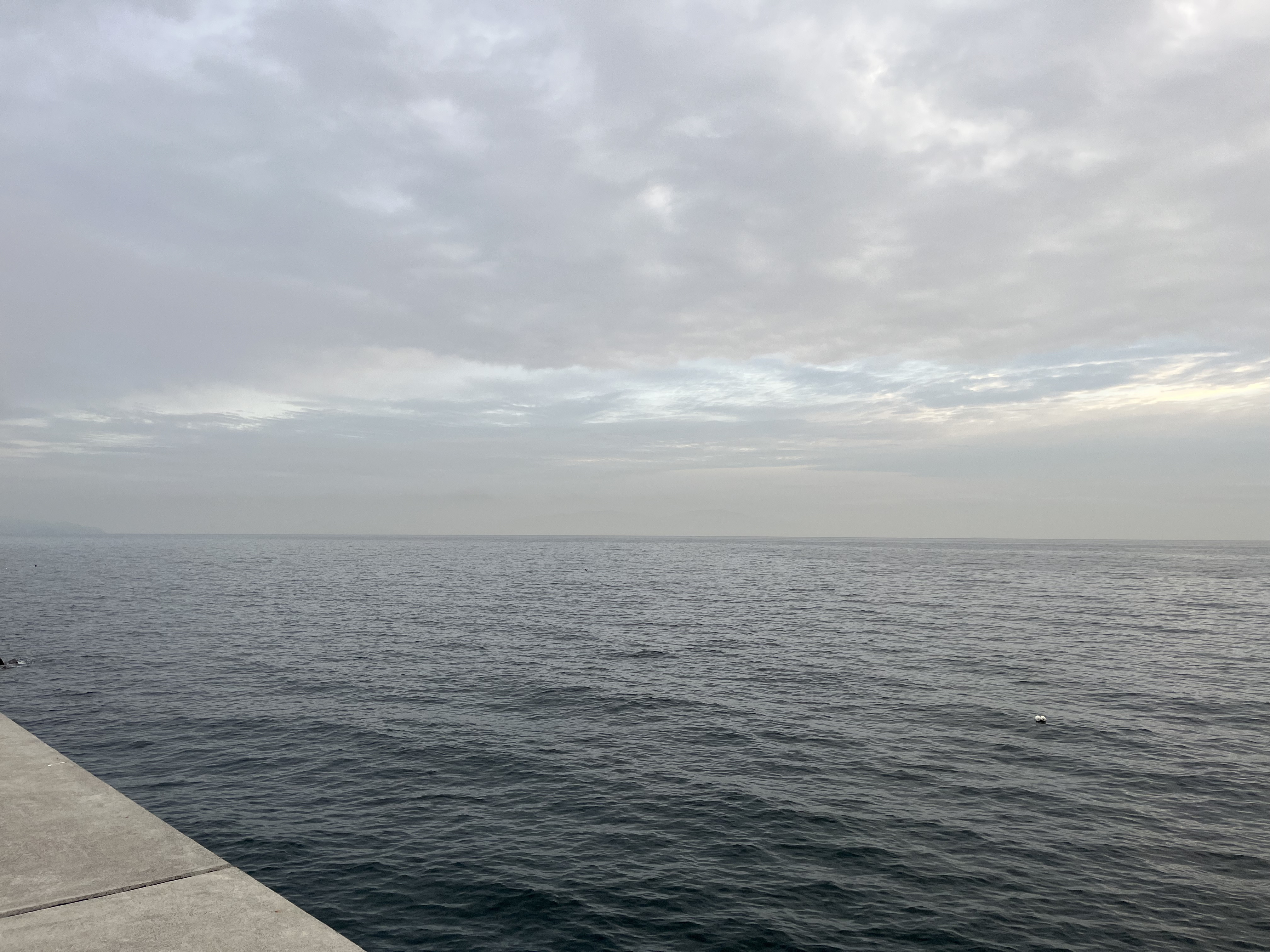 気温9℃、曇り、雲が空全体を覆い、与治山頂上付近も雲が懸っています。水平線にも霧が掛かり、里山もかすかに見えるだけ、阿讃山脈はほとんど見えません。試験場の吹き流しはだらり状態、海には少しうねりがあります。海水が港に流れ込んでいます。太陽は雲の向こう。釣り客は東波止に1人、テトラに1人です。北の空の雲に切れ間ができ、明るくなって来ました。
