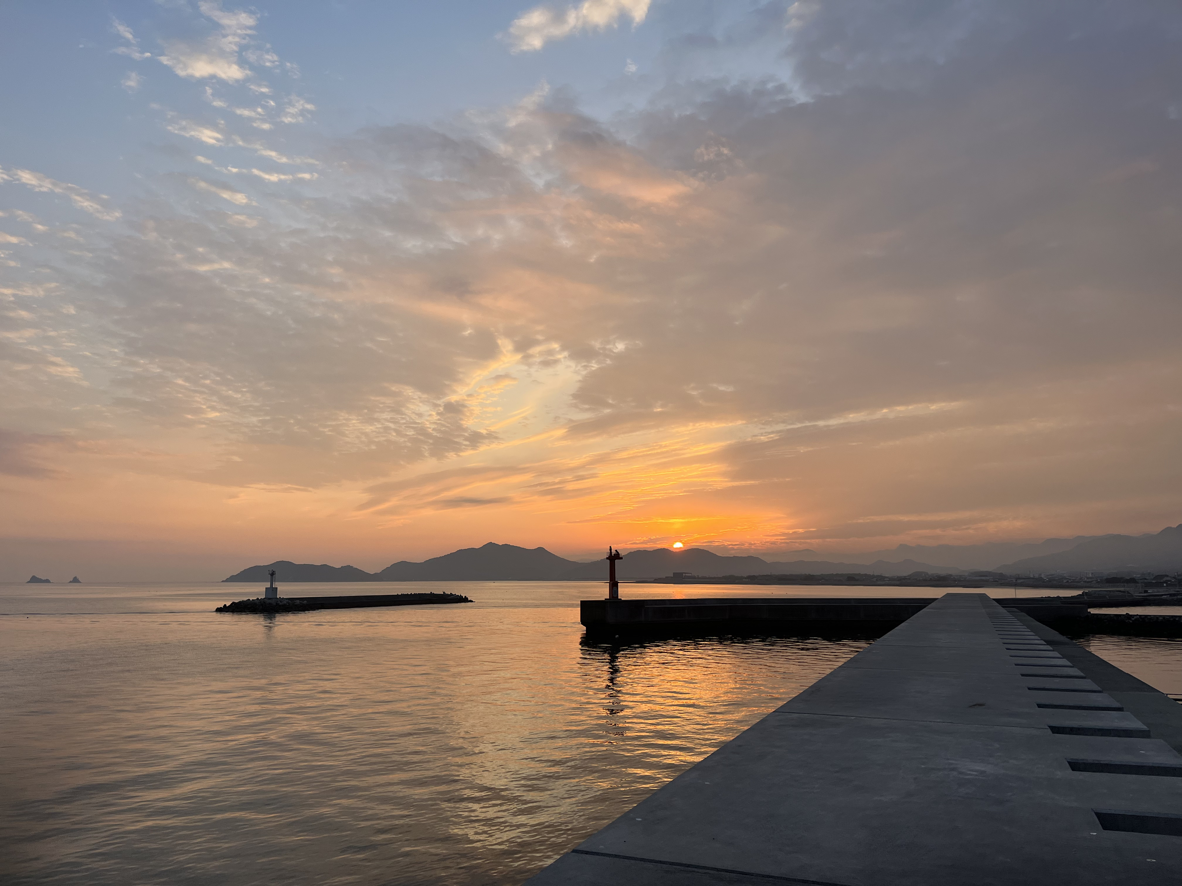 気温8℃、晴れ、雲がたくさん見えます。吹き流しがだらり状態で、海も穏やかです。淡路島、小豆島は見えません。輪郭のはっきりしないぼんやりの太陽が伊座山塊のすぐ上の雲の合間から出て来ました。雲が紅く染まっています。月は雲の向こう。釣り客はテトラに1人。港ではいつもの様に生簀の作業が始まっています。