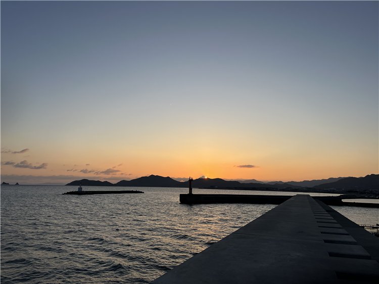 気温1℃、快晴、北西の風が緩く吹いています。海は少しうねりがあります。淡路島も小豆島もくっきり見え、阿讃の峰々は白の雪化粧が濃くなっています。更待月が、雄姿を誇る虎丸山の真上に残っています。太陽が伊座山の上、雲に見え隠れしながら姿を見せました。釣り客はテトラに1人です。港では生簀の作業が始まっています。