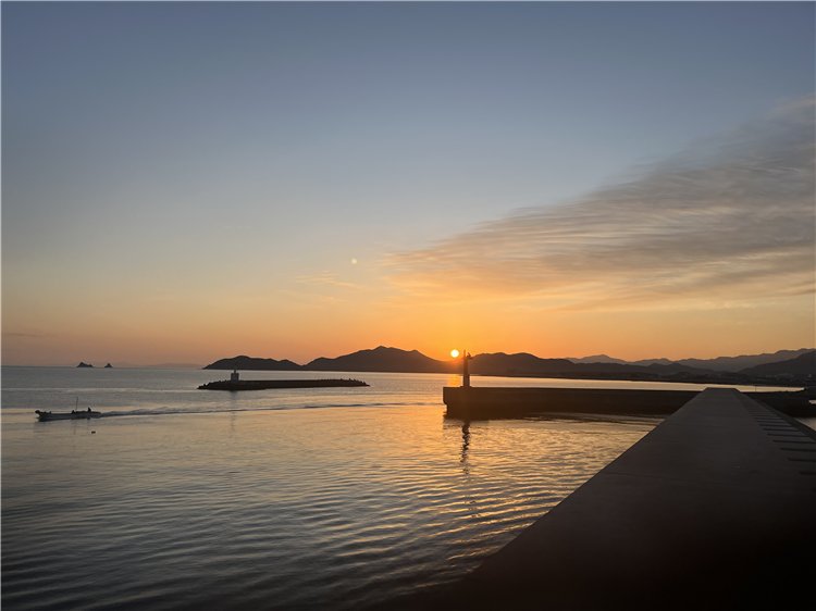 気温2℃、晴れ、風はほとんどなく、海も穏やかです。紅い太陽が、6時53分、伊座山塊と与治山塊の谷間に出て来ました。今日の日の出時刻は昨日より1分5秒程度早く、これからお彼岸まで早さを増し、4月初めに5時50分くらい、6月中旬には4時50分になります。釣り客はテトラに1人、そのすぐ沖合いを漁船が仕掛けを回収しています。漁船の後にはカモメが10数羽、骨休めか、浮かんでいます。