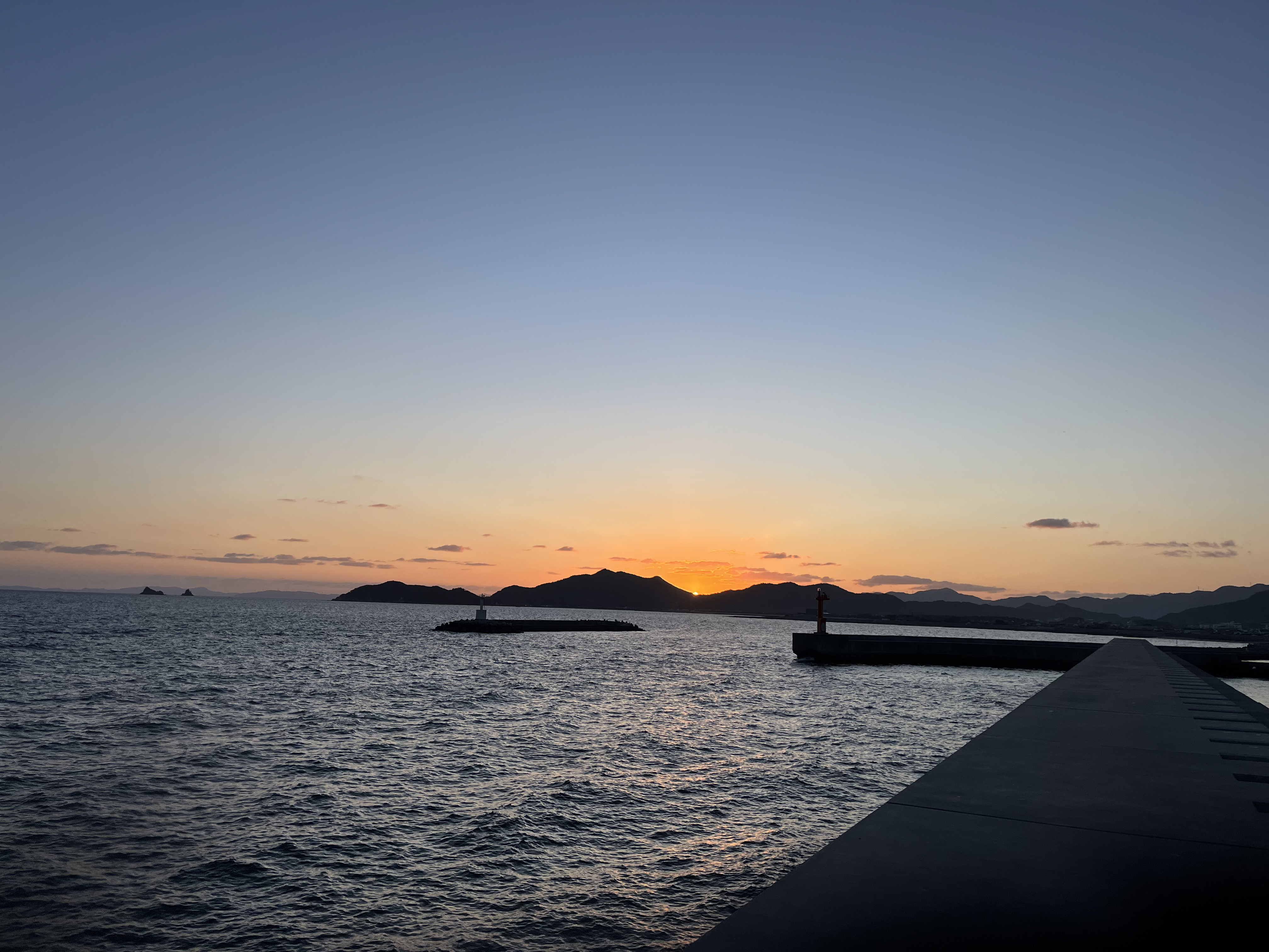気温2℃、快晴、雲は水平線に近い所にほんの少し浮かんでいます。タダノ試験場の吹き流しは10°程度で風は無く、海はそれでもうねりがあります。6時49分35秒、太陽が伊座山塊と与治山塊の谷間の一番底に姿を見せました。釣り客はテトラに1人? この波止を飛び立った20羽程度の鳩の群れが上空を舞っています。