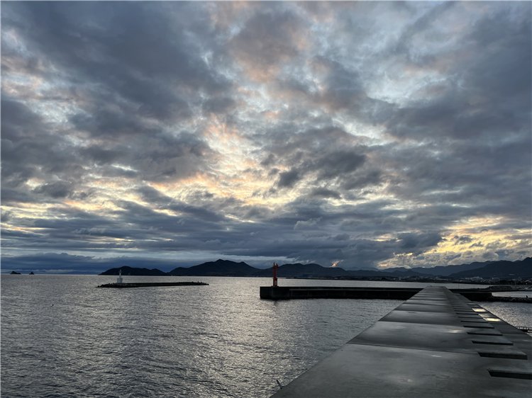 気温10℃、曇り。雨が上がり、空には青空もあって、水たまりがあちこちに見えます。防波堤に上がるとすぐ下のテトラからシラサギの群れが飛び立ちました。空気は澄み、小豆島が朝の光を浴び、寒霞渓の稜線もくっきりです。淡路島はもちろん、雲が懸る六甲山や赤穂の山々も見えます。日の出位置の与治山には雲が懸り、その上の方が明るくなって来ました。鳩の群れが朝の飛翔です。釣り客は赤灯台に1人です。