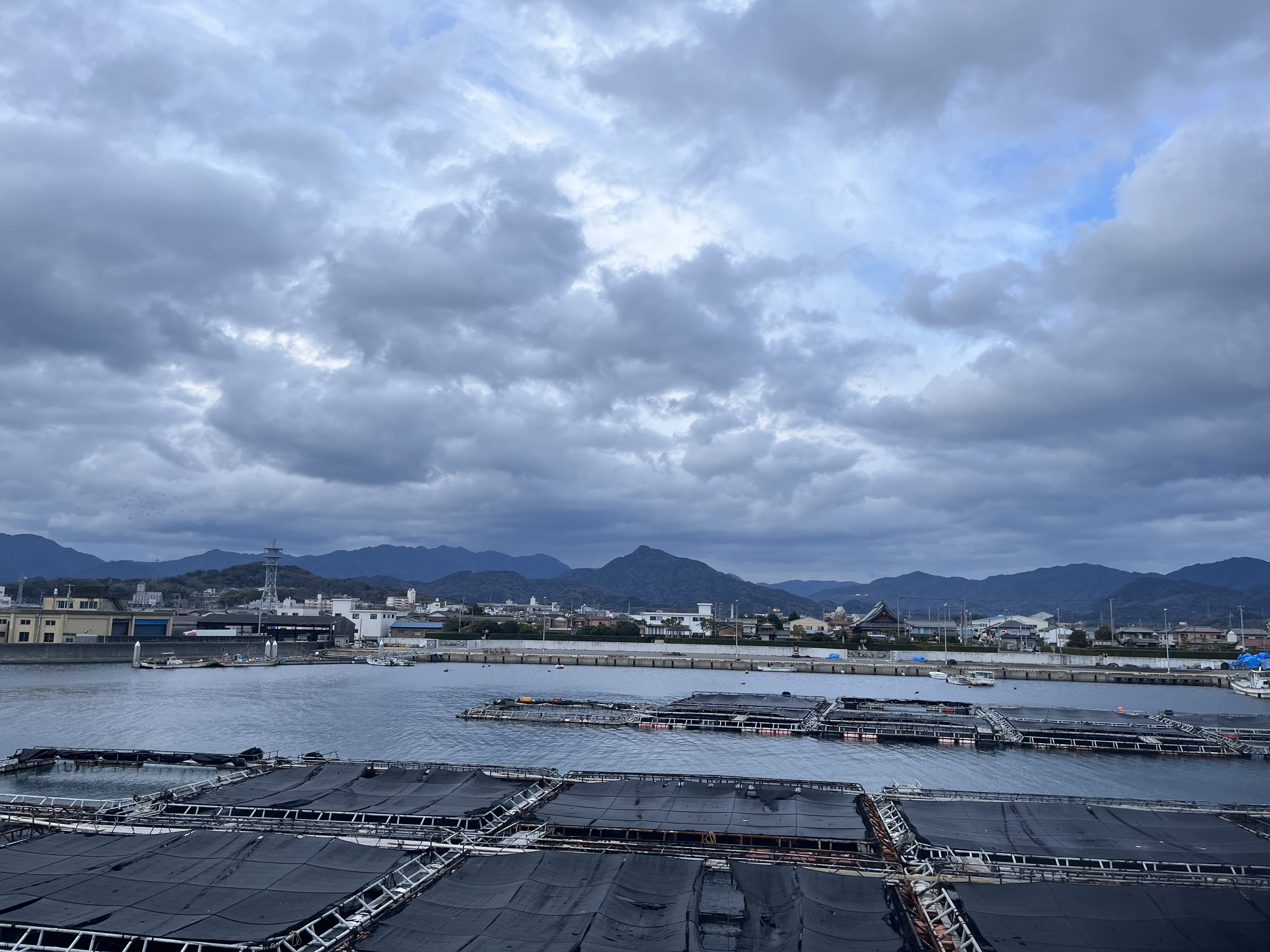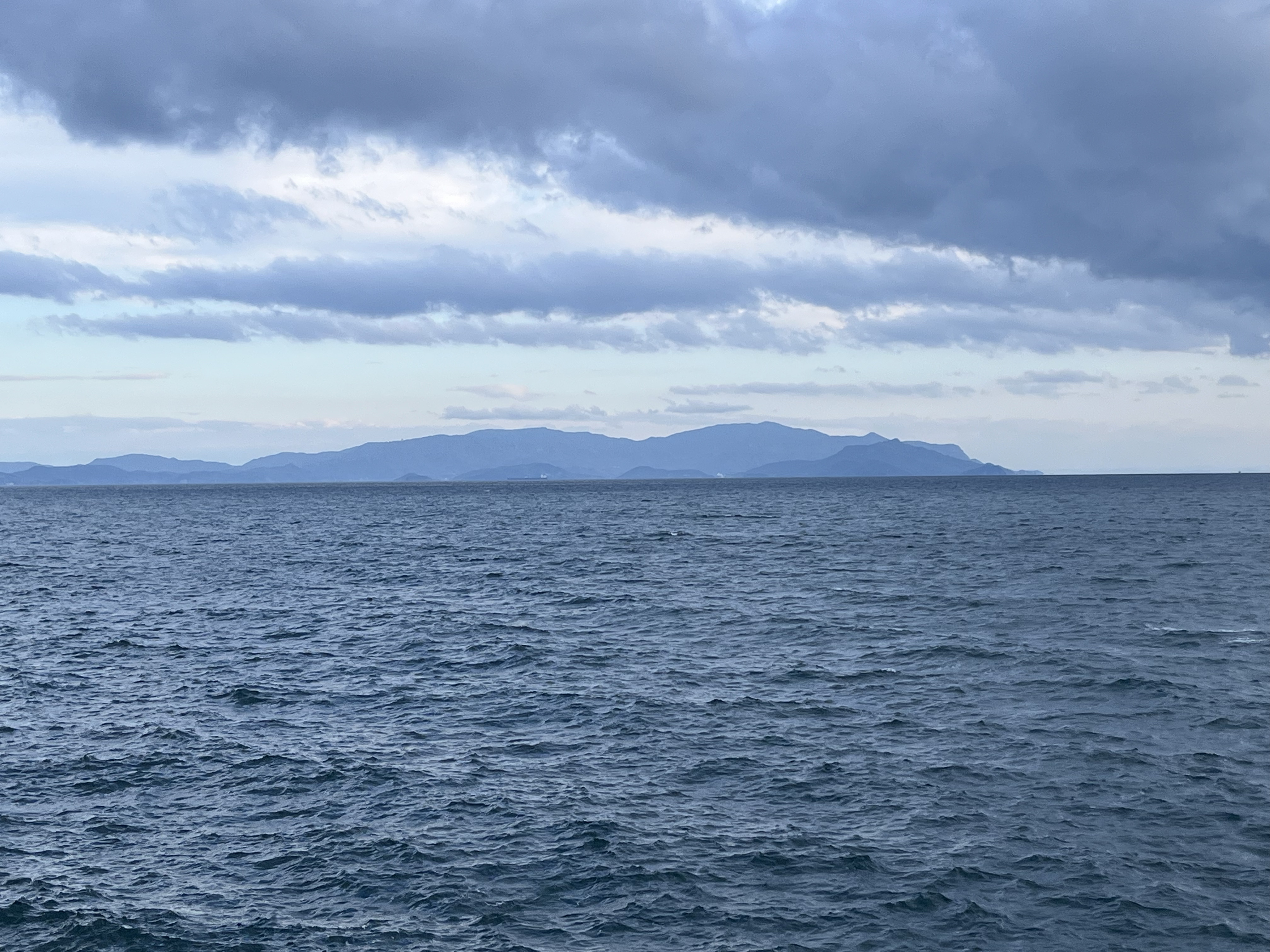 気温6℃、曇り、厚い雲が空を覆い、西北の水平線、地平線付近は明るく晴れの様相です。東の空は雲で覆われ、太陽の気配も見えません。風は次第に強くなり、西寄りの風、吹き流し角度30°くらいが、北の風、吹き流し角度45°くらいに変わり、白波も立っています。小豆島の南の航路を真っ白の旅客船にっぽん丸(167m、幅24m)が東へ向かい、暫くして、西へ向かう大型原油タンカーENEOS ARROW(339m、船幅60m)が現れました。にっぽん丸はこの5月で引退だそうです。