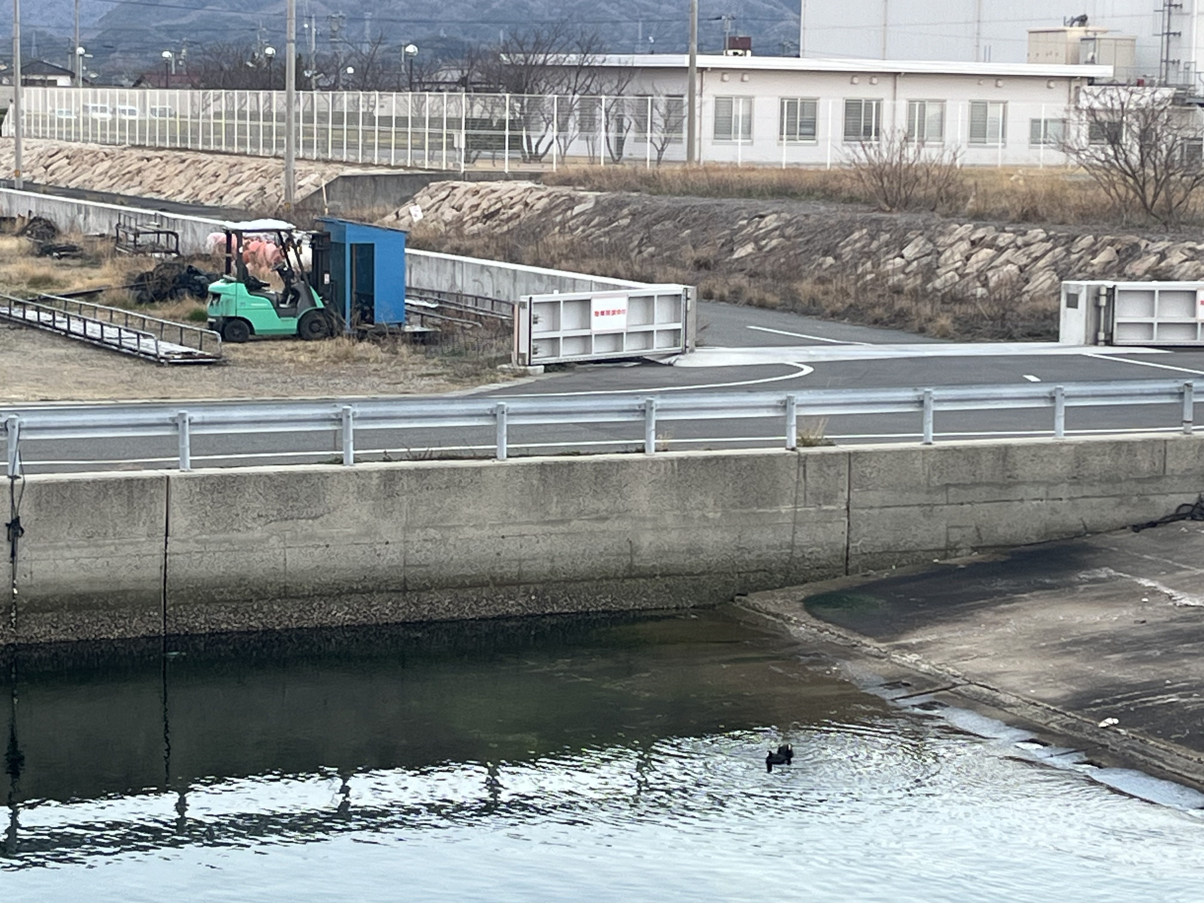 気温5℃、曇り、北西の風が緩く吹き、雲も西の方から晴れて来ています。東の空には少し厚い雲が懸り、太陽は与治山の北の斜面に一瞬姿を見せ、斜面に沿って雲に隠れて行きました。一子島の向こうの航路を黒い貨物船が2艘(152mと82m.FindShipより)が鳴門海峡の方に向かっています。釣り客はゼロ。くちばしだけが白い黒いカモ(オオバン?)が2羽、港のスロープ付近で遊んでいます。