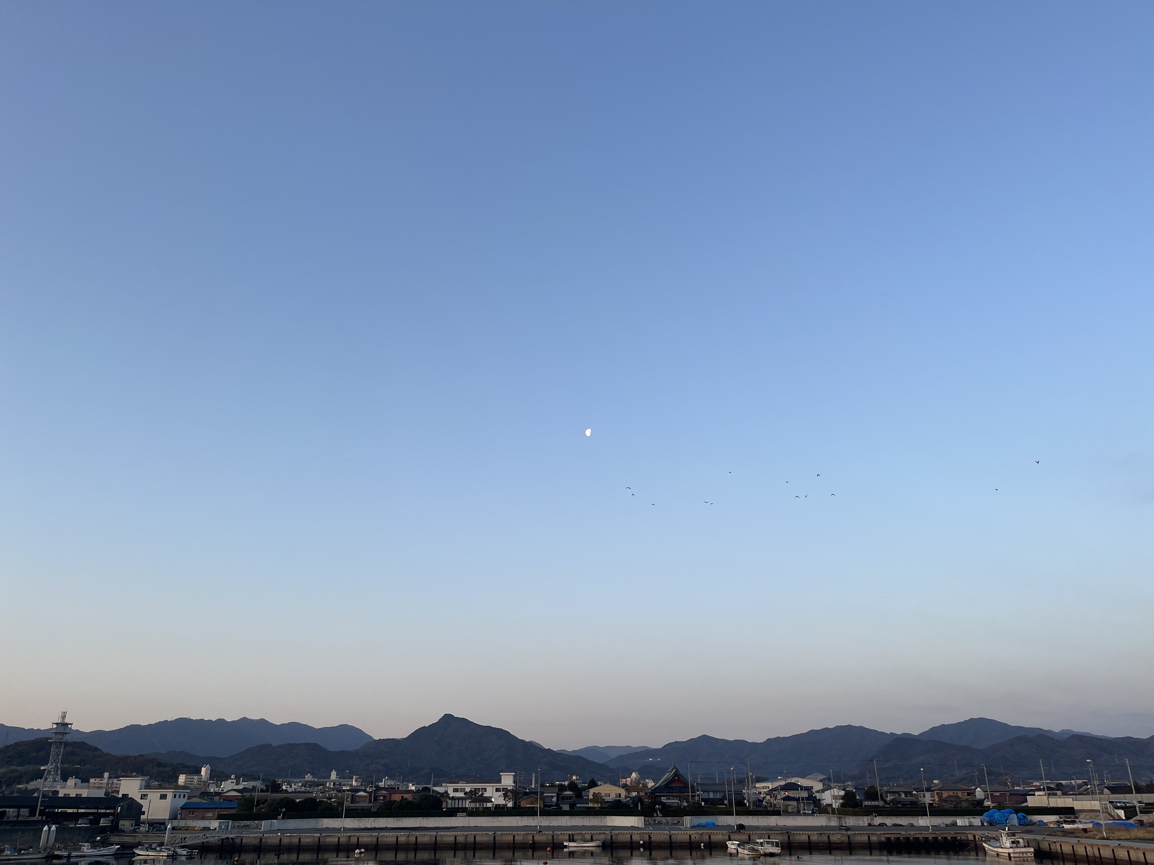 気温3℃、快晴、ぐっと冷え込んでいます。橙色に染まる東の空を白い飛行機雲が西に向かっています。風は緩く、海は穏やか、半分くらいに細った月が虎丸山の右に残っています。太陽が与治山のうすくの北の斜面から出て来ました。釣り客はゼロ。帰り際、ベトナム航空のHVN334(ハノイ→関空、B787-9Dreamliner)が阿讃山脈の上空を東に向っていました。