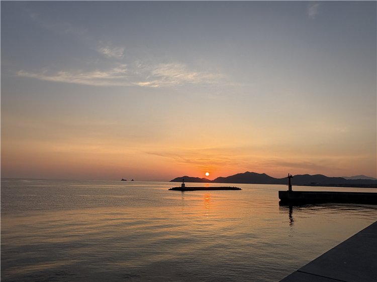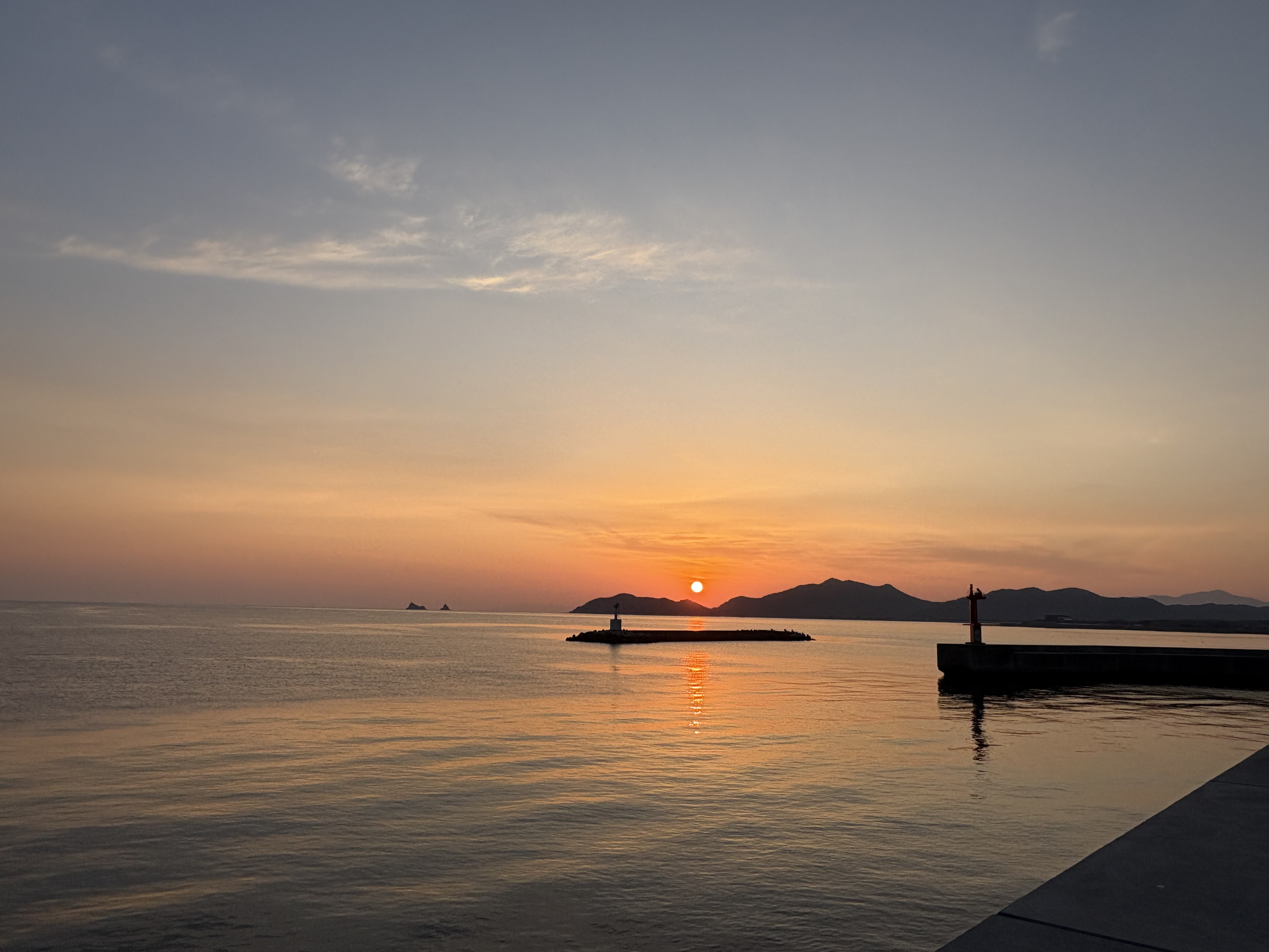 気温6℃、白い雲が薄く空全体に拡がっています。港の入り口に差し掛かった時には紅い太陽がもう昇って来ていました。風はほとんどなく、防波堤の直ぐ近くの海面は鏡のようにつるつるで、漁船が作業をしながら少しずつ移動し、鵜が素潜りを楽しみでいます。少し沖合いにはさざ波が見えます。釣り客は東波止に1人、テトラに1人です。阿讃山脈、虎丸山も雄姿を誇っています。