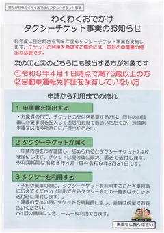 お届けするタクシーチケット事業のタクシーチケットは24枚つづりになってます。なので、令和八年だと令和八年の四月から令和九年の三月までで24枚最大使えるようなものになっております。