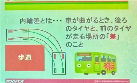 はい。ごめんなさい。そしてですね。ちょっと毎回こういった場で話をさせていただくときというのは出してるんですけど。内輪差。皆さん、言葉は聞いたことあると思うんですけど。走る場所、タイヤが通る場所、前輪と後輪違いますよ、というものなんですけれども。