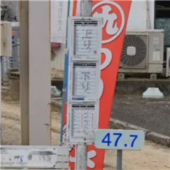 今回これも出晴のバス停をちょっと写真出したんですけど、淀釣具店さんの前ですね。こんな感じで。実際見たらわかるんですけど、上りって書かれた時刻表と下りって書かれた時刻表が両方貼ってます。