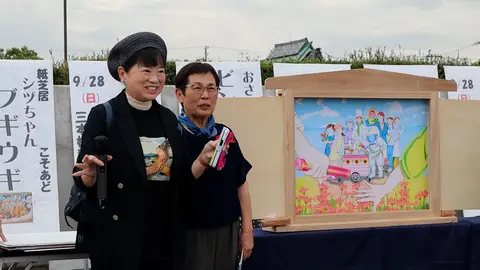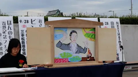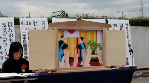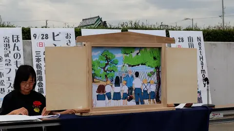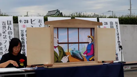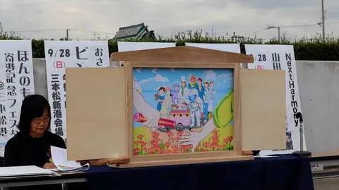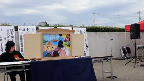 子どもたち、大先輩、紙芝居始まるので、ぜひ前の方に来てください。子どもたち、前の方に来てください。ちゃんと席を用意してますよ。子供たち、前の方に来てくださいよ。