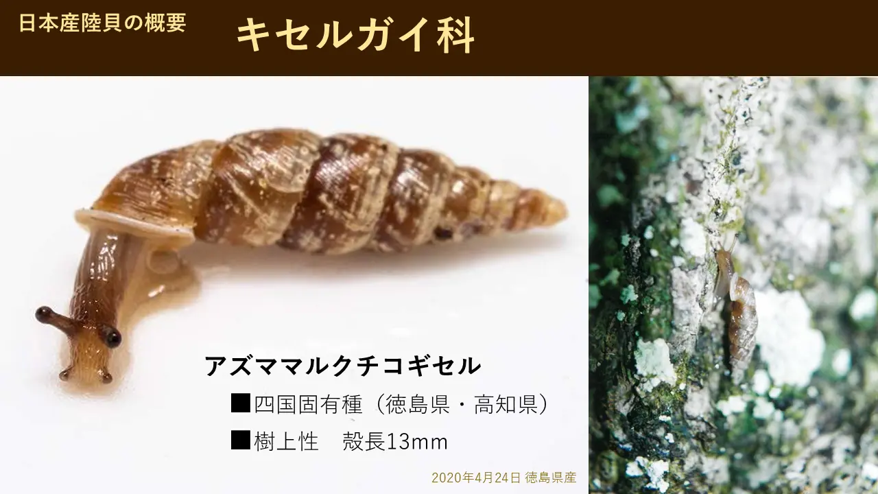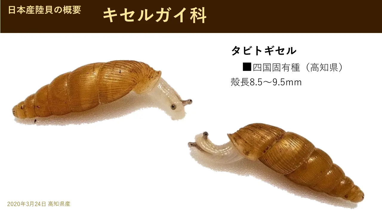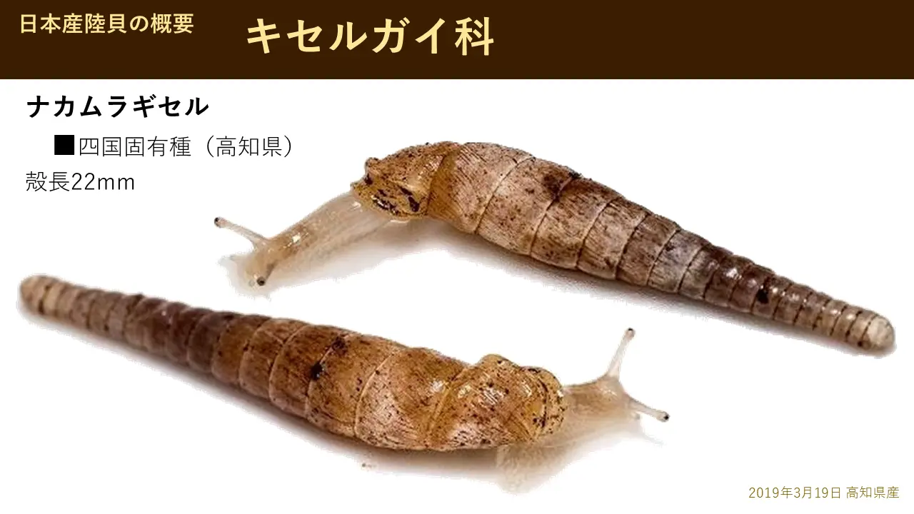 これはね、中村さんという人が見つけまして、ナカムラギセル。これは四国でも固有種ですし、固有属と言いましてね、いろいろ大きく、あのキセルがもうグループに分かれるんですけども、これと私が見つけた白肌ギセルいう、この2種類だけは、特殊なグループです。2種類だけいわゆる別格のグループなんです。おそらく古い時代から生きてきたカタツムリだと思います。