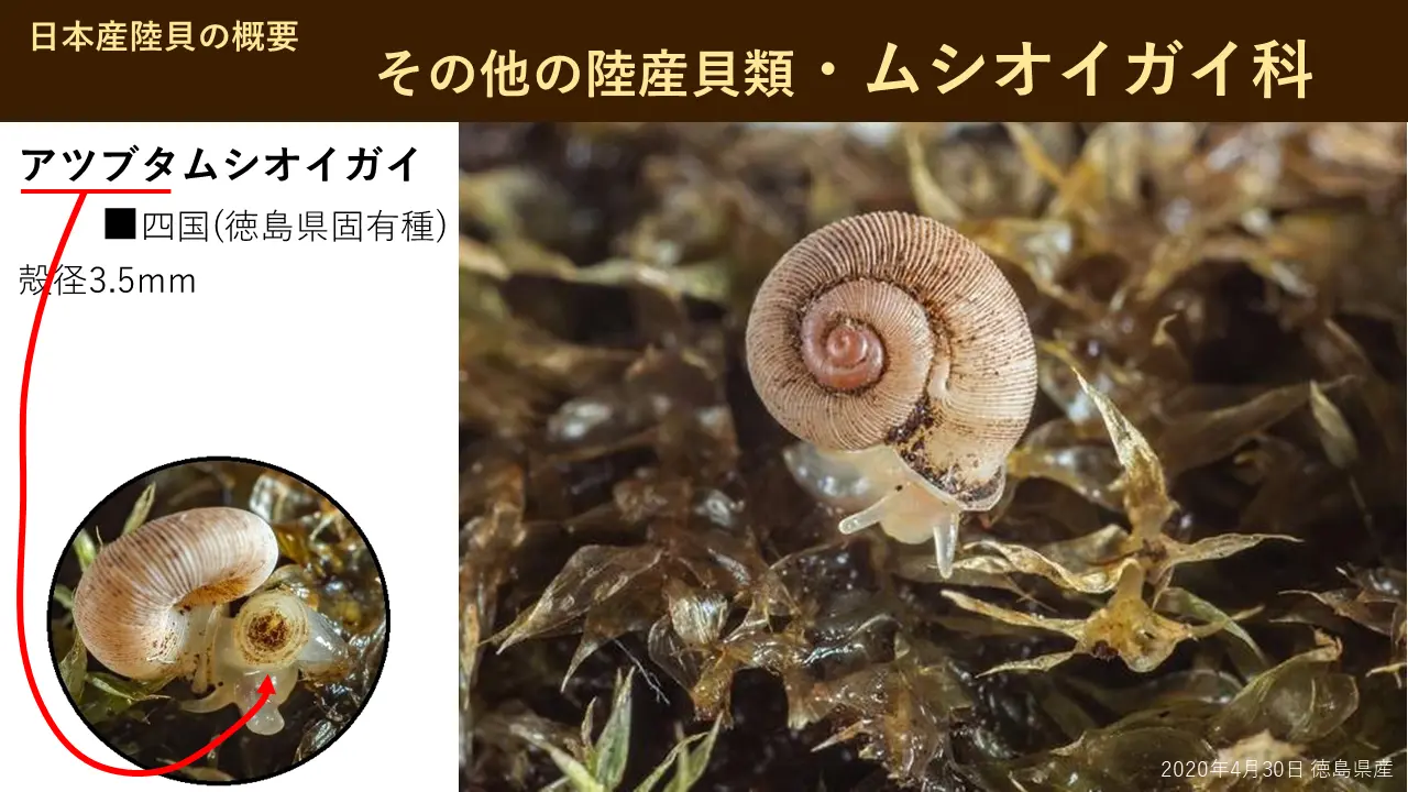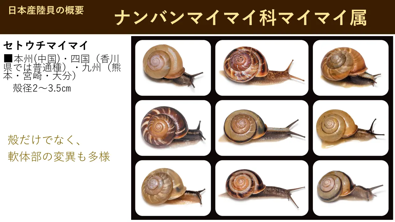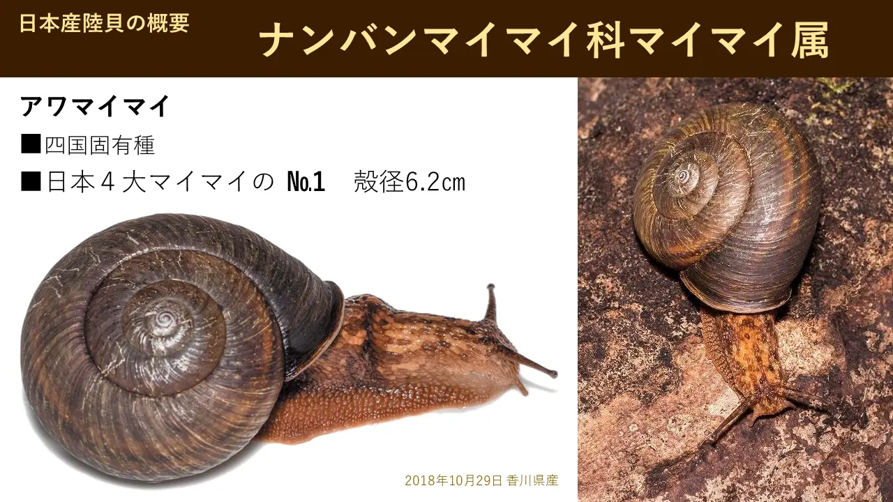これがですね、四国固有種でアワマイマイと言います。香川県で見つかっとったら、サヌキマイマイになったかもわからんけど、徳島県で見つかったためにアワマイマイで、このアワマイマイというのは巨大です。日本では一番大きいんです。6cm、そこに、並べてありますから、ぜひ見て帰ってください。あれは、並べているのはね、だいたい5.8、あの、6cmありません。6cm以上になりますと、ちょっとね、めったに見つかりませんけどね。もう世界、日本で最大級です。