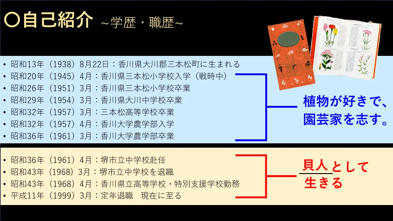 私、七年。大阪で教員して、七年でもう潔く教員やめまして、三本松へ、帰ってきたんです。で、三本松から高知や、愛媛や、あるいは徳島や、そういうところで研究してですね、まあまあ、お世話になった人たちに恩返ししたいなと思って、帰ってきたんです。