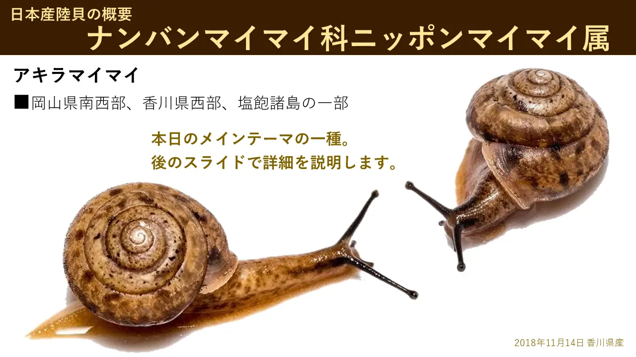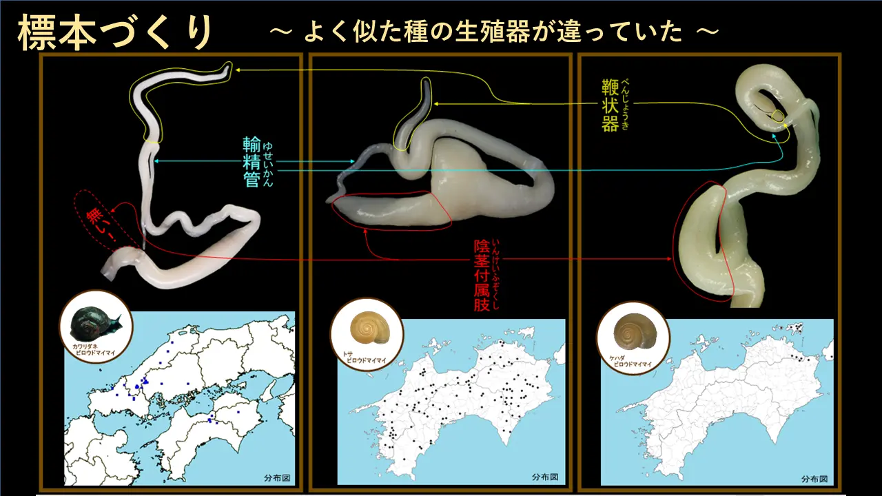 これ、今からお話しします。これは、アキラマイマイが、もうあんまり自分のばっかりやったら笑われるんですけども、まあ、ちょっと言わせてもらいますと、初めはまあ、私が解剖しよったんです。それから分布図もそれで、描いていっきょったんです。ところが・・・ちょっと次の開けてみてくれますか。