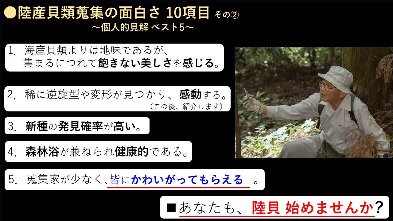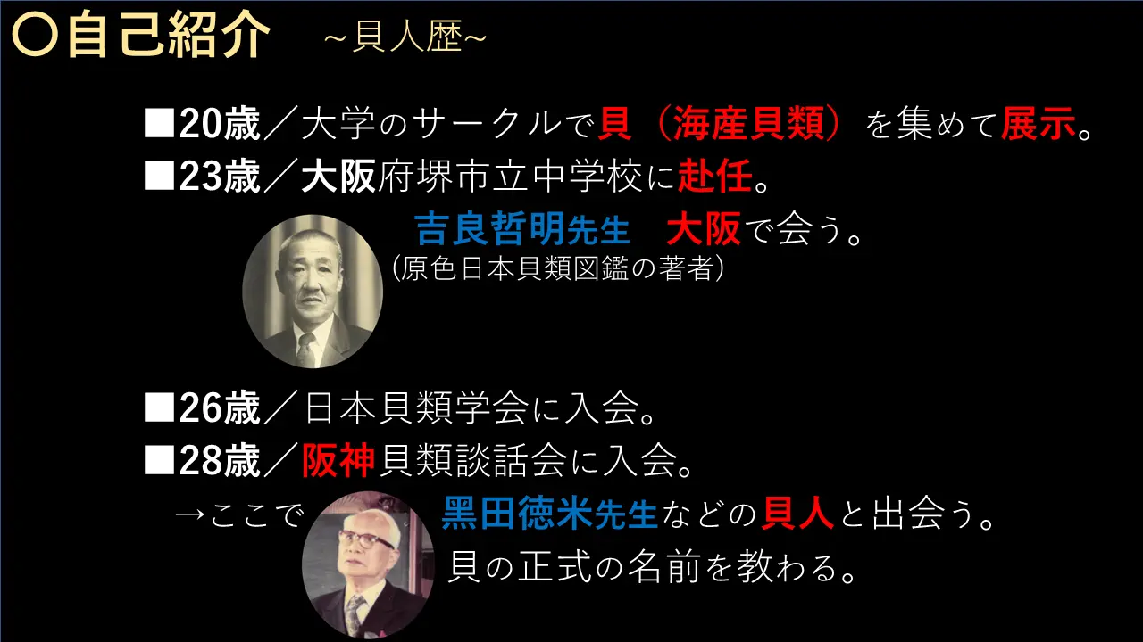 カタツムリに興味を覚えたきっかけは大学でちょっと遊び半分で集めた海の貝から、貝でちょっと興味が出まして。そして、貝の先輩に会うことによって、まあ、焚き付けられたという感じですね。それでは、ちょっとまたこんな、いらんことばっかりやったんで、もうこんなのはもう省きます。どうぞ、ちょっと進めてください。
