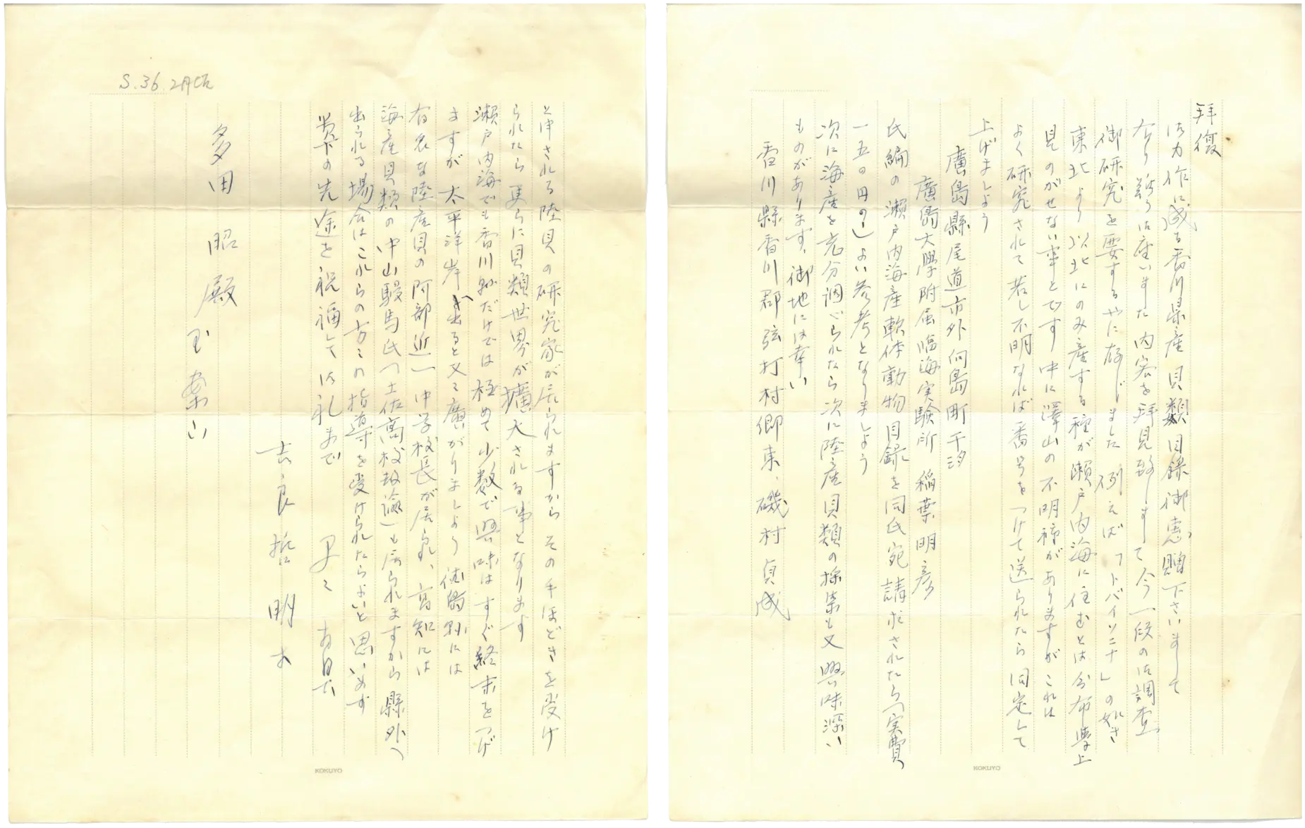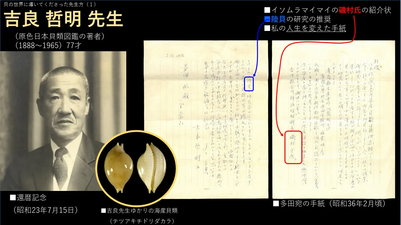 この人が吉良先生で、私を導いてくれたんですけども、早く亡くなられましてねえ。でもこの人が私に手紙くれまして、その手紙の内容を見るとですね。まあ、これは、私が香川県三本松におる時にいただいております。もう海の貝は研究がだいたい進んだので。カタツムリ、陸貝をやりなさいと、この吉良先生が導いてくれました。