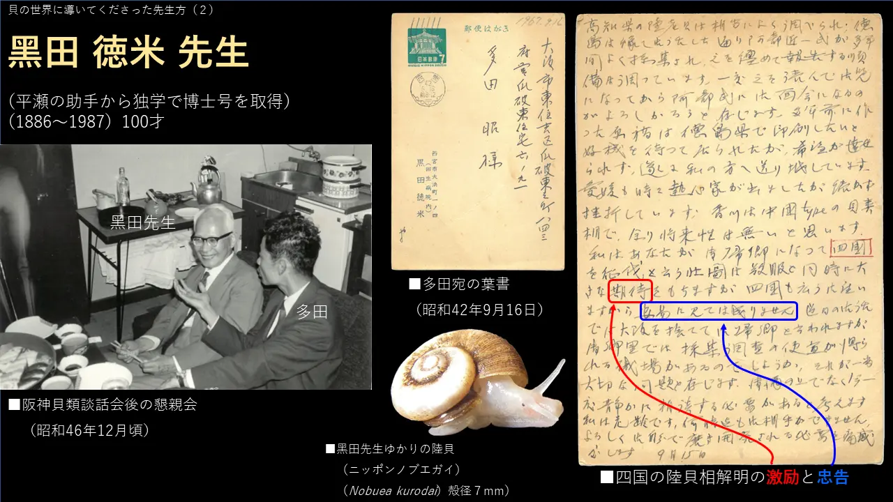 もう一人の方はこの黒田先生と言いまして、この人がまあ言うたら、日本では一番。貝の研究では、第一人者です。日本貝類学会という学会を作った、この方が作られたんです。で、私とこういうツーショットですけども、まだ髪がしっかりある時代ですけども、よくしてくれました。