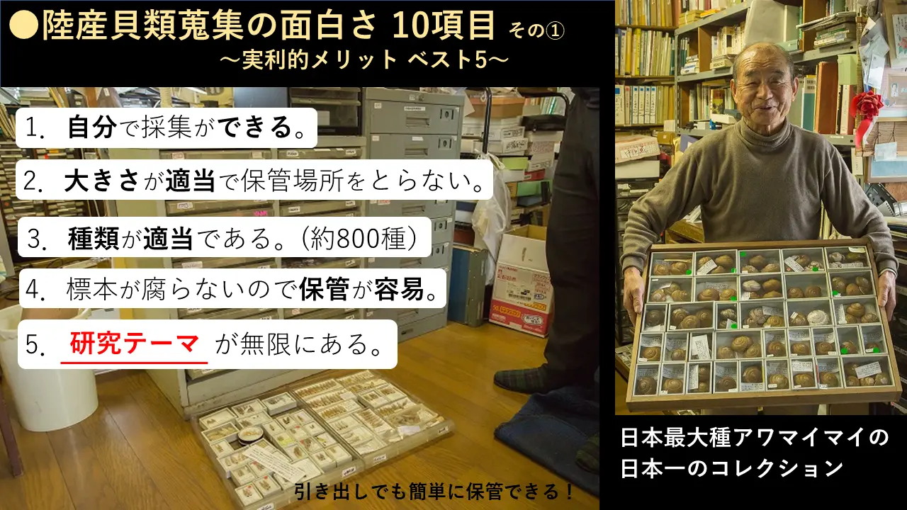 あ、これですね。標本の重要さ。あの、よくね、カタツムリの標本ってね、中に、なんでこんなようけ採るんなって言うていう人があります。あんたがようけとるけん、絶滅するんじゃいうて。