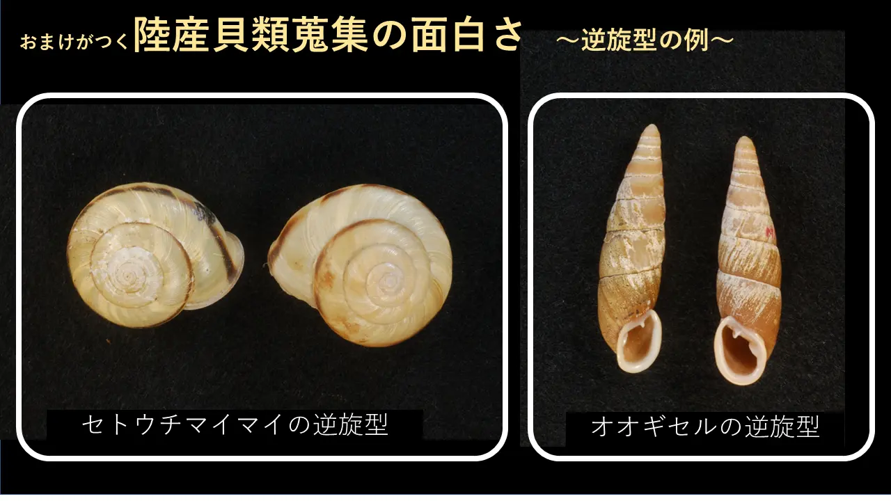 それから、先ほど言いました、世界で一番大きなキセル貝のオオギセルも、これが正しいんですよ。正常な個体です。で、これが反対巻なんです。