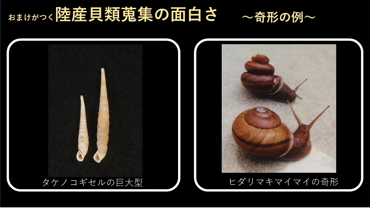 それからこういう奇形も生まれます。これはちょっとね、あの殻が傷つきますと、こういうちょっと変わるんです。で、昔、私も倉敷で採ったのに逃がしてしまってね。1週間、倉敷通いました。