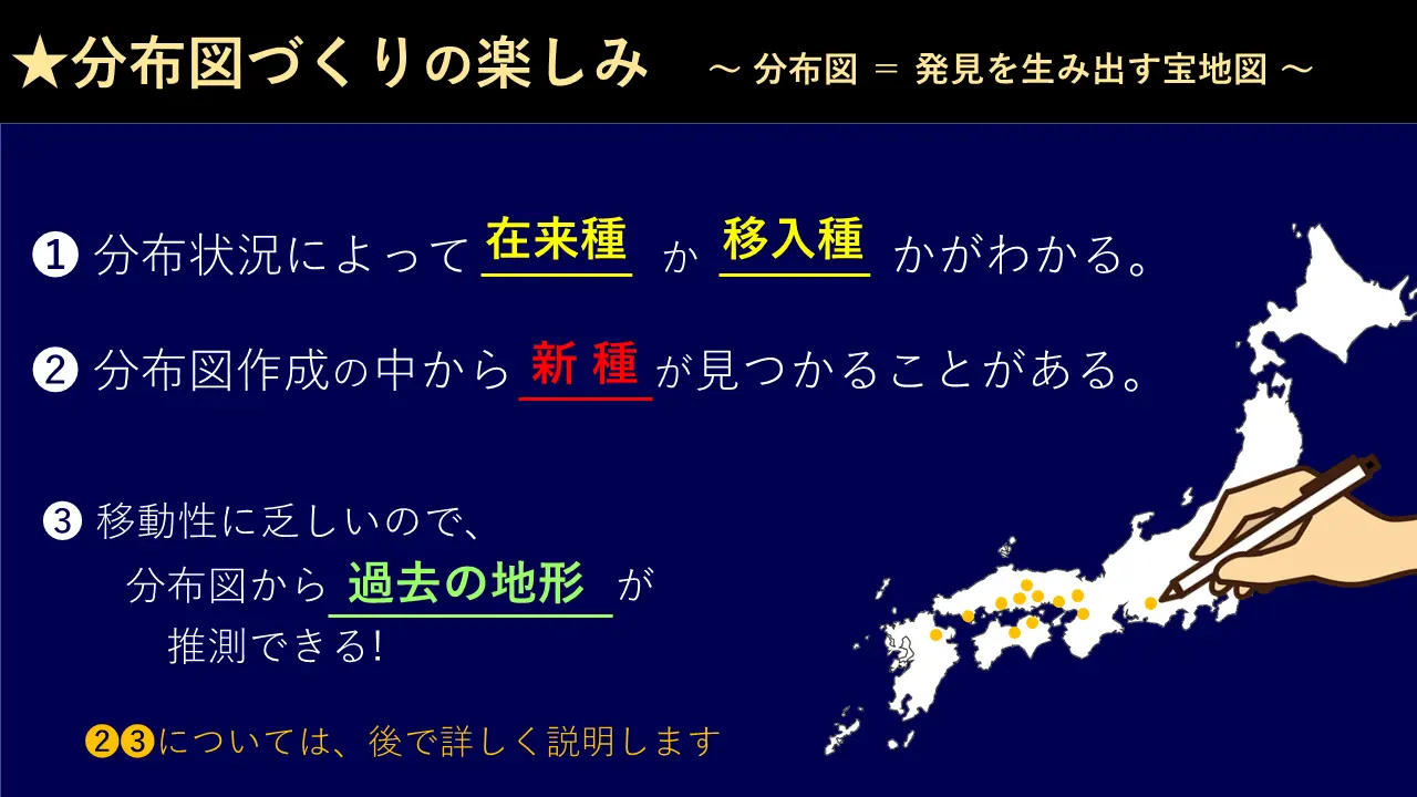 分布図作り、これはね、初めて採ってきて、種類がわかる。一体この種類はどういう風な所におるんかな、ここだけかな、もっと広くおるんかな、というのを分布と言います。