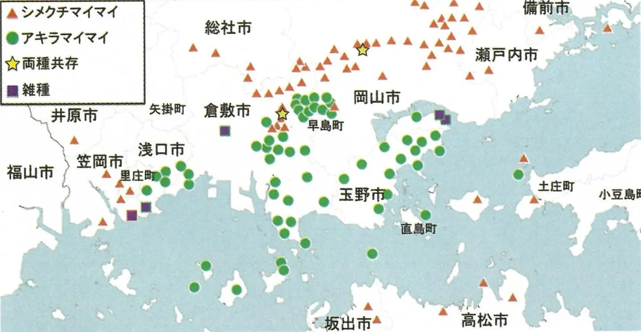 そしてその岡山の人は一生懸命、岡山の付近を駆け巡って、そしてこの三角印。▲印がシメクチマイマイです。で、●がアキラマイマイです。どうもこの辺りで境目があるのが分かりますね。